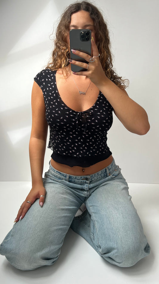 00s black mesh floral babydoll top- size XS