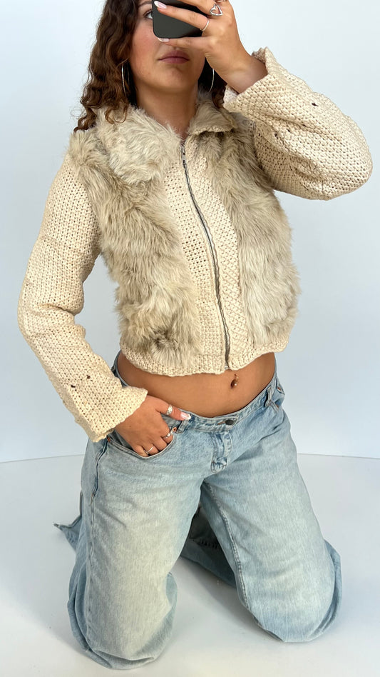 00s cream knit fur jacket- size M