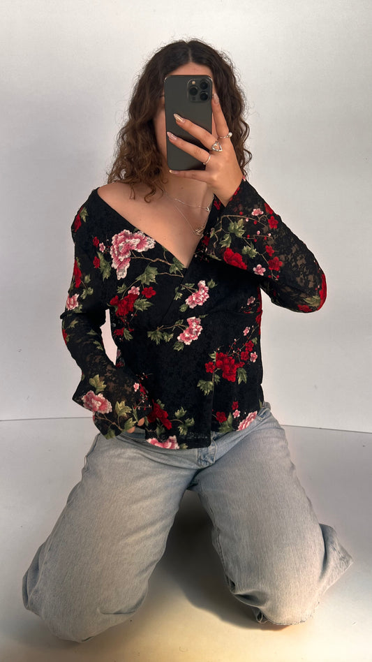 00s black lace floral top- size XL
