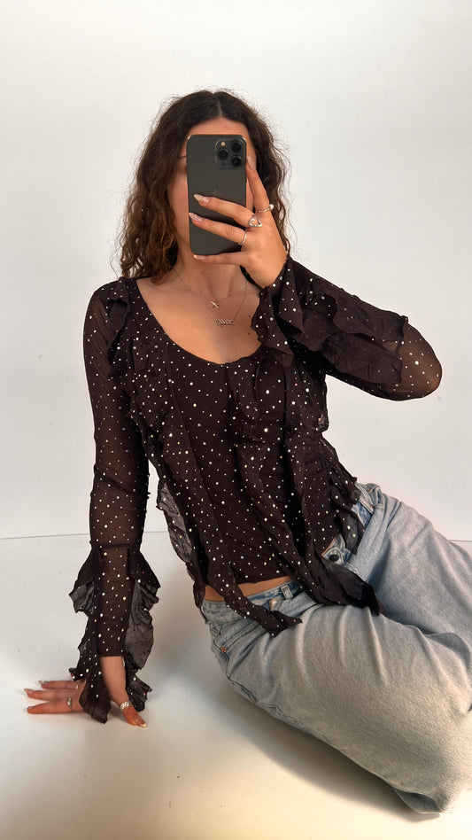 00s brown ruffle mesh top- size S