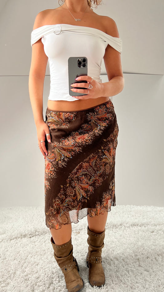00s brown paisley mesh midi skirt- size M