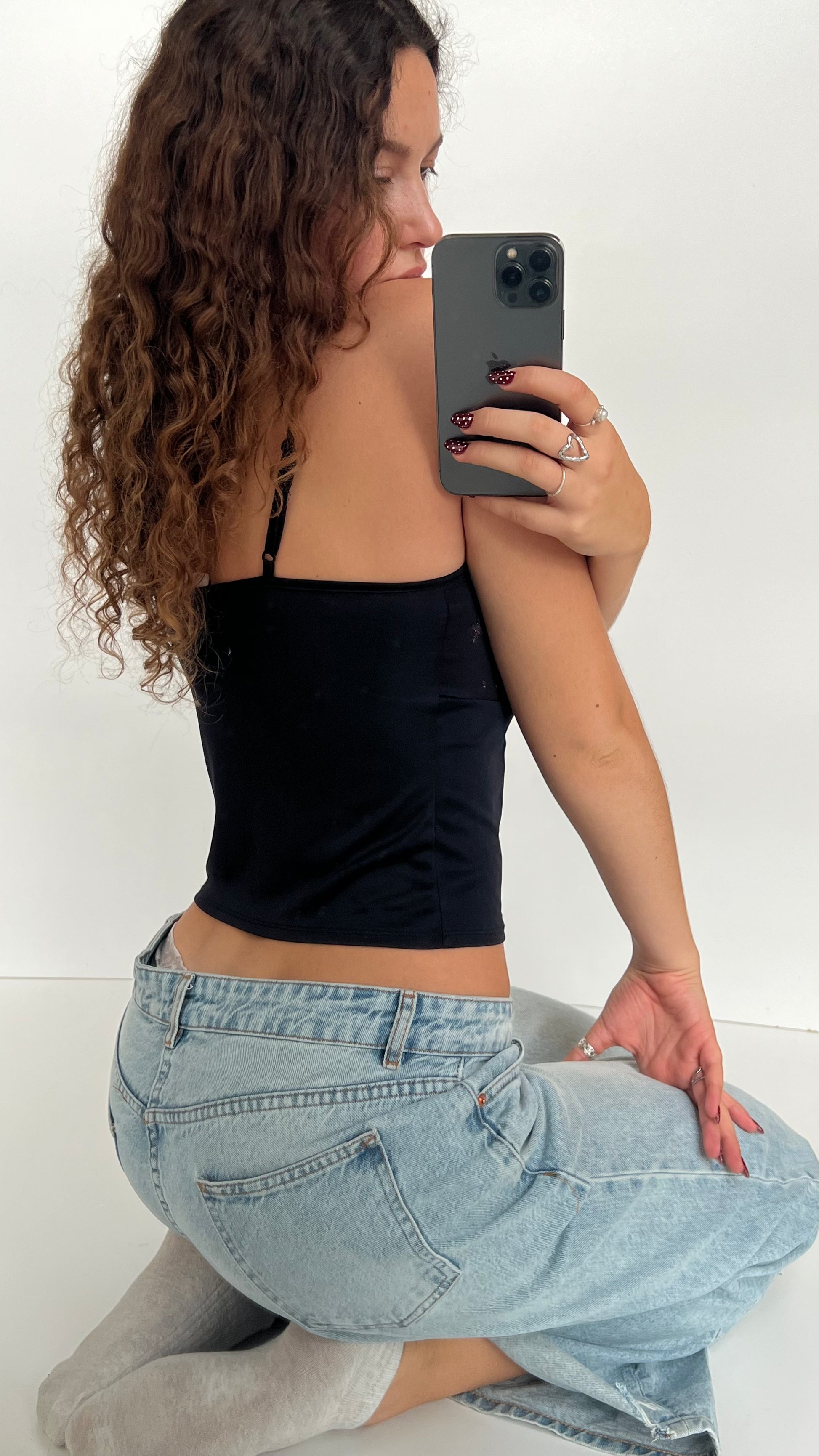 Brand is vintage Kookai. Stretchy black flower embroidered lace cami with adjustable straps.