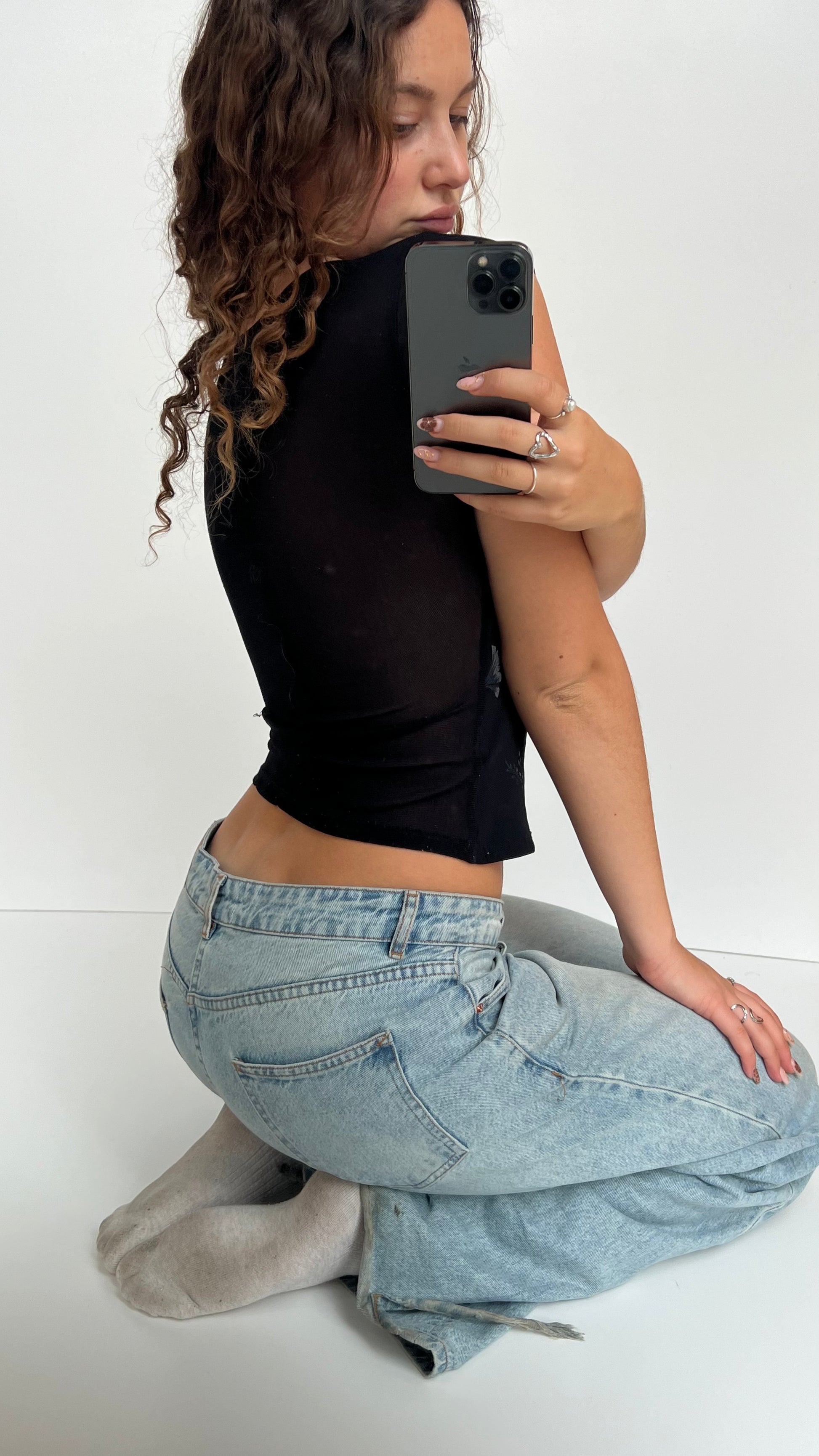 Black stretchy floral mesh babytee with double lined front.