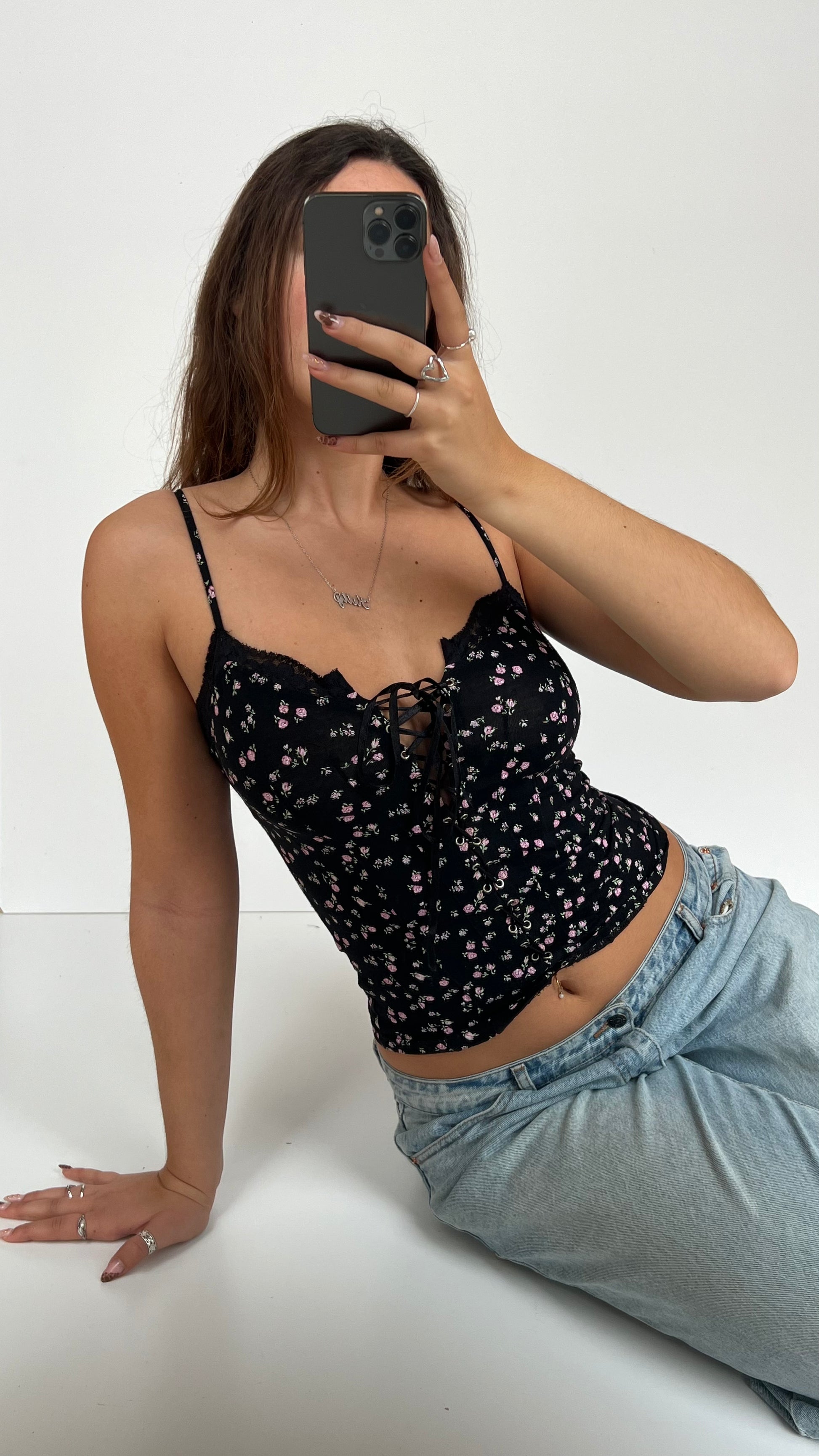Brand is vintage Pimkie. Black stretchy pink floral cami with lace up front.