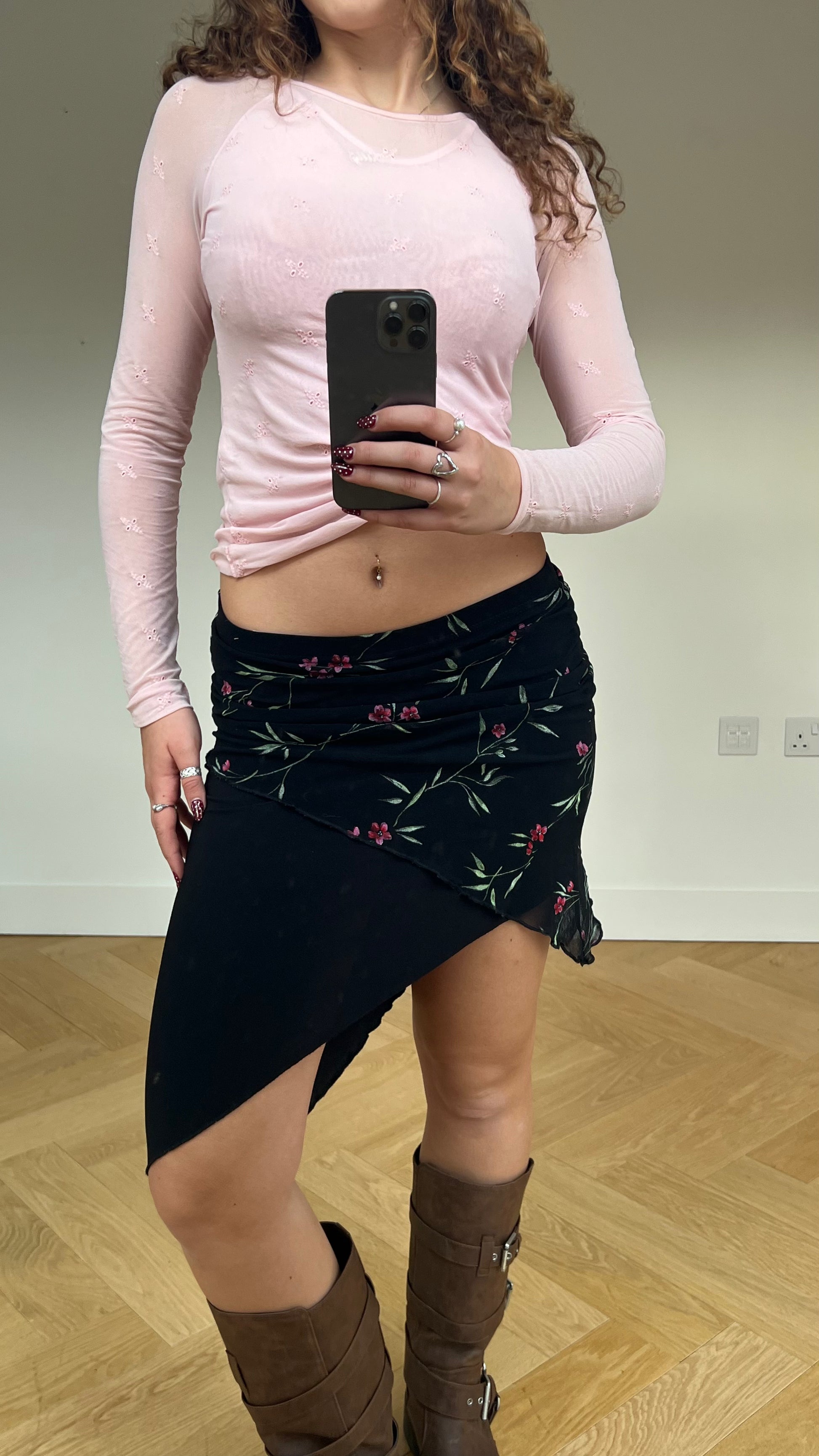 Low rise black asymmetric midi skirt with pink mesh floral design. Stretchy.