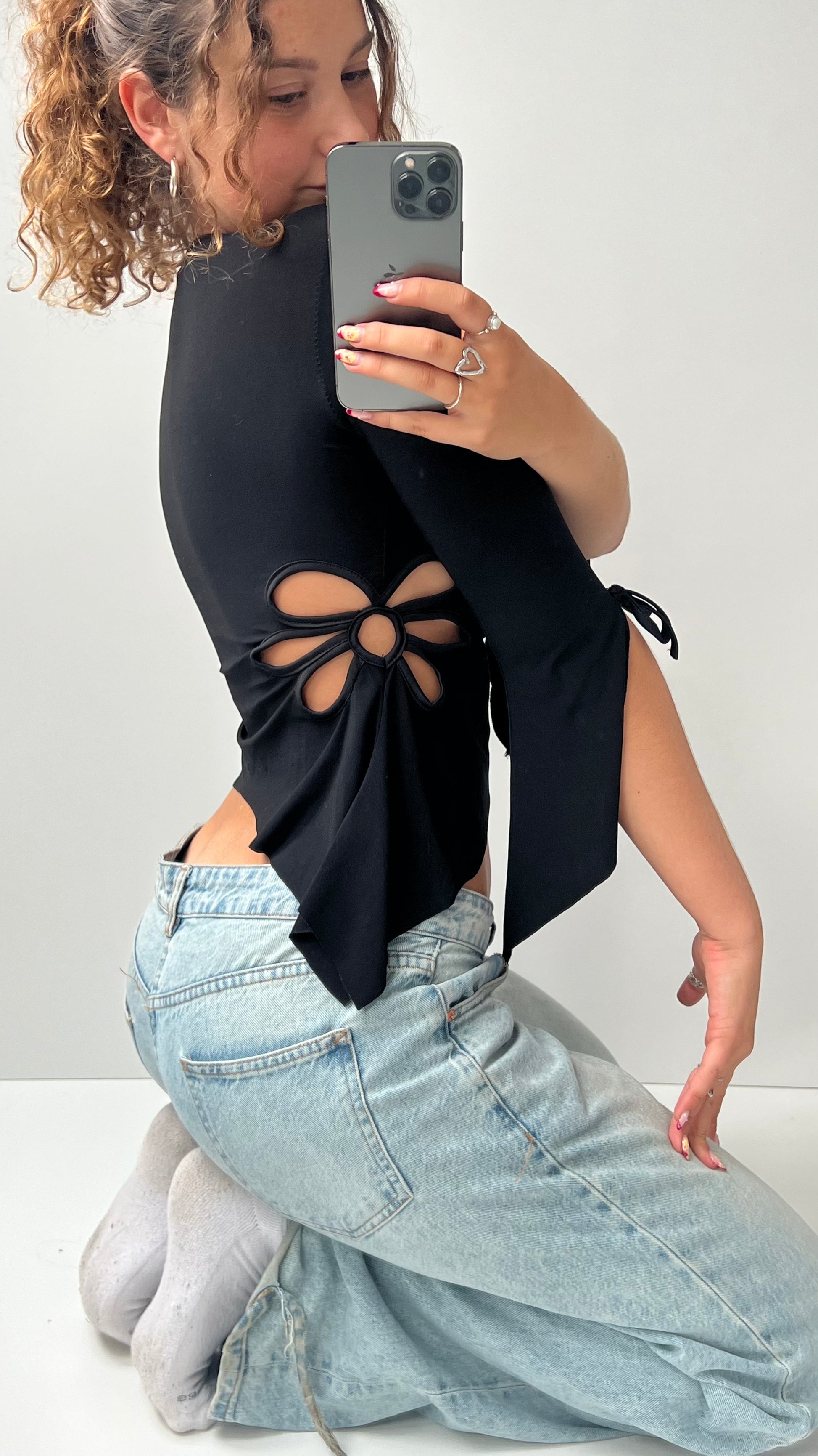 Asymmetrical black long sleeve top with flared sleeves and flower cut out sides.
