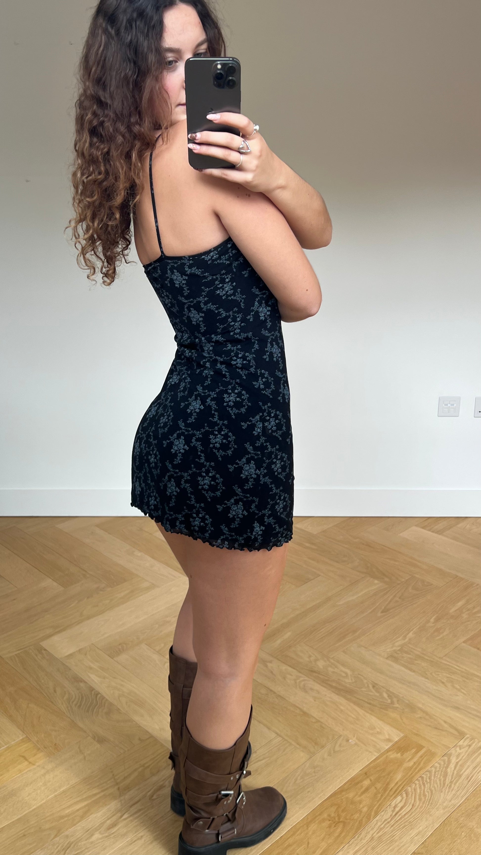 00s black mesh floral mini dress- size M