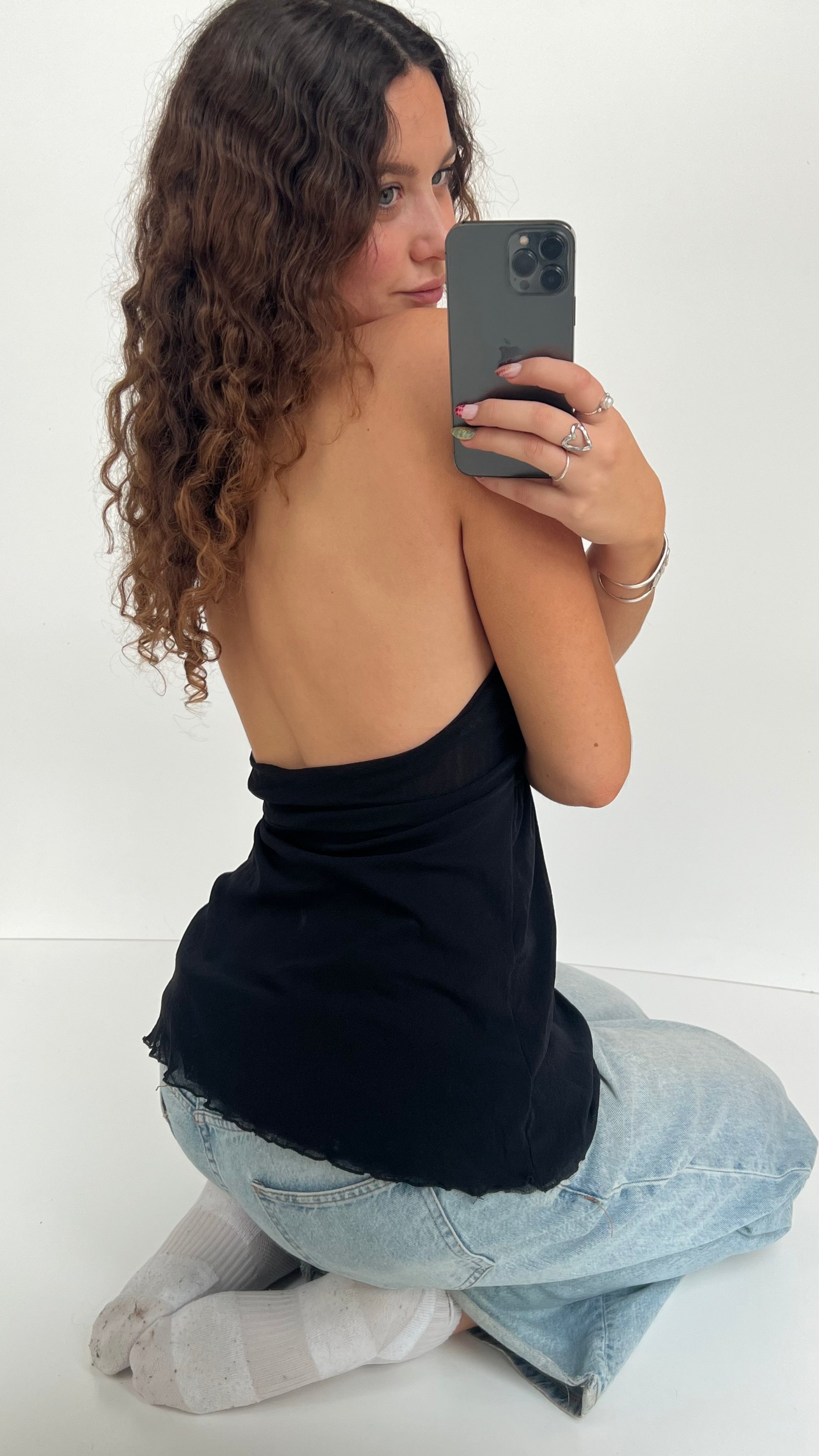 Black mesh halter cami with sequin trim. Stretchy with adjustable halter tie.