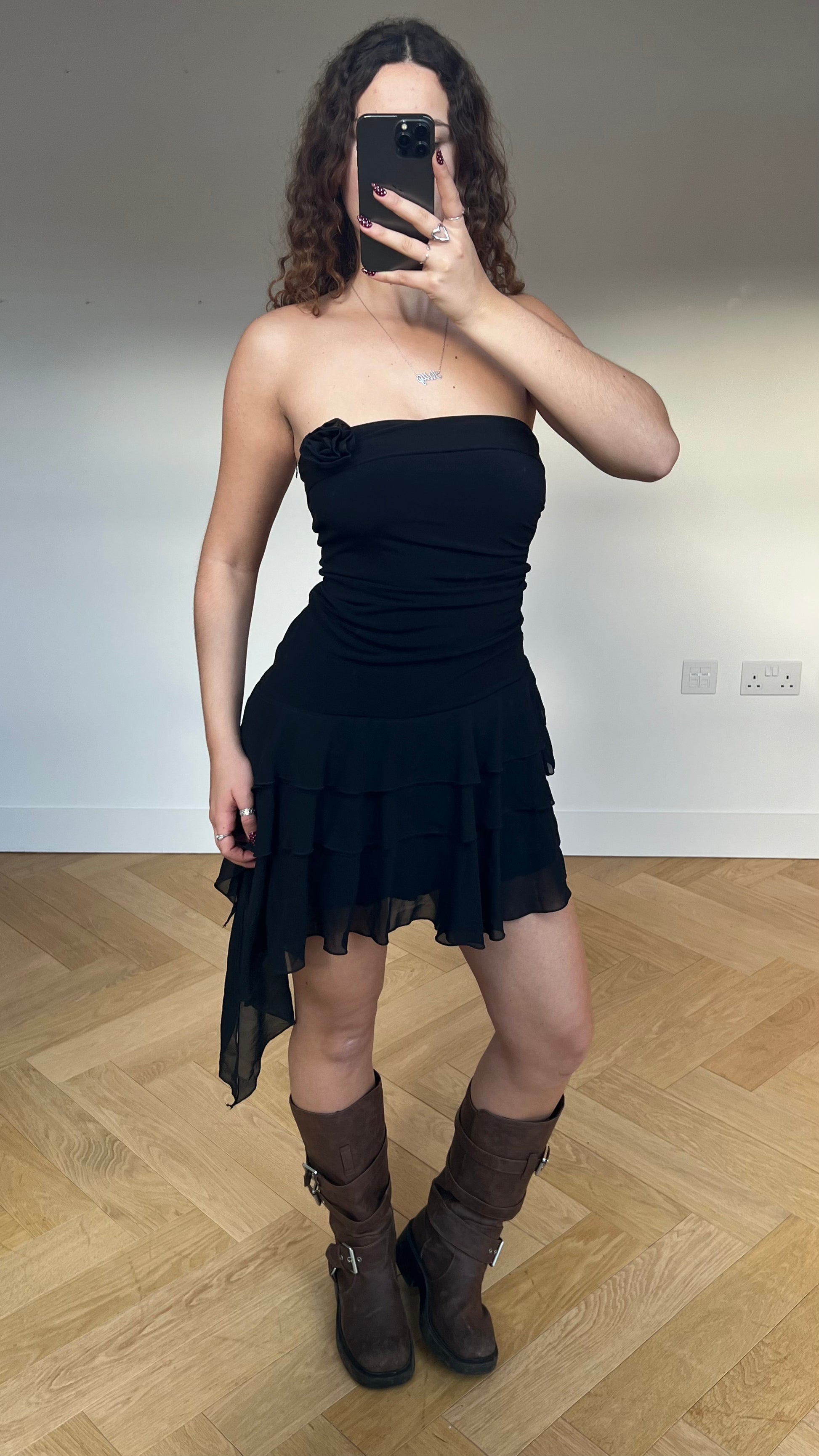 Black mesh asymmetrical ruffle mini dress. Strapless with flower detail.