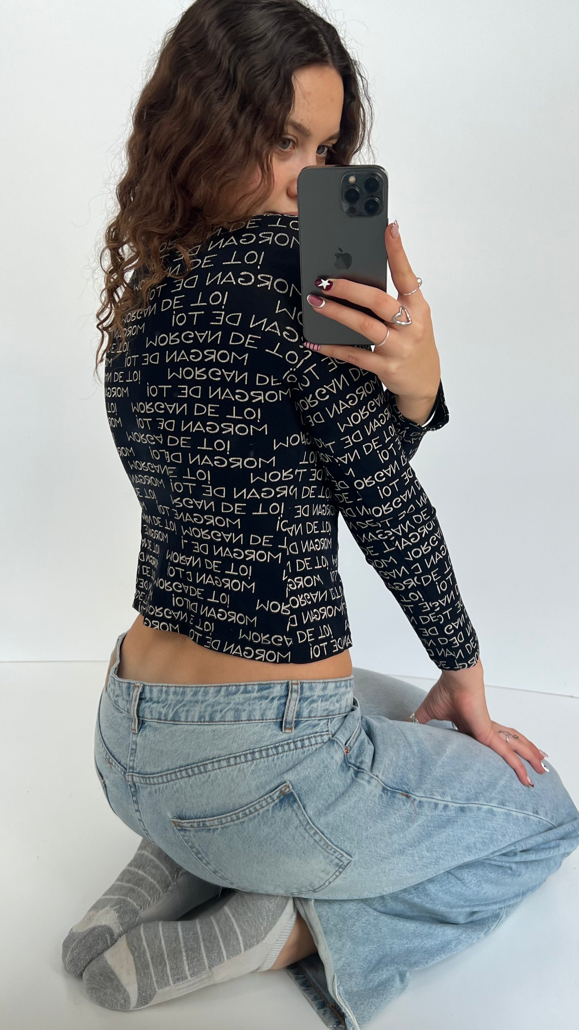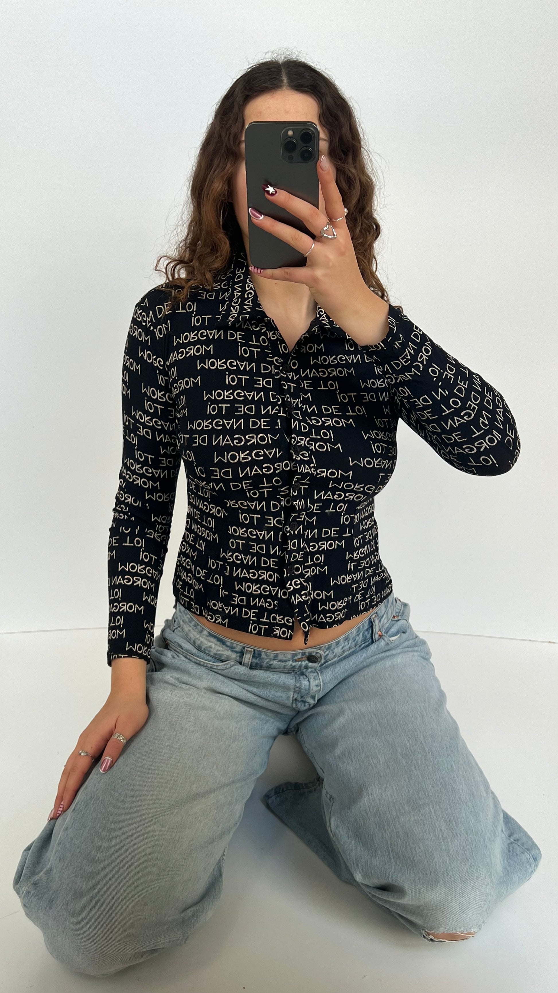 Brand is vintage Morgan De Toi. Black stretchy shirt with branded spell out pattern.