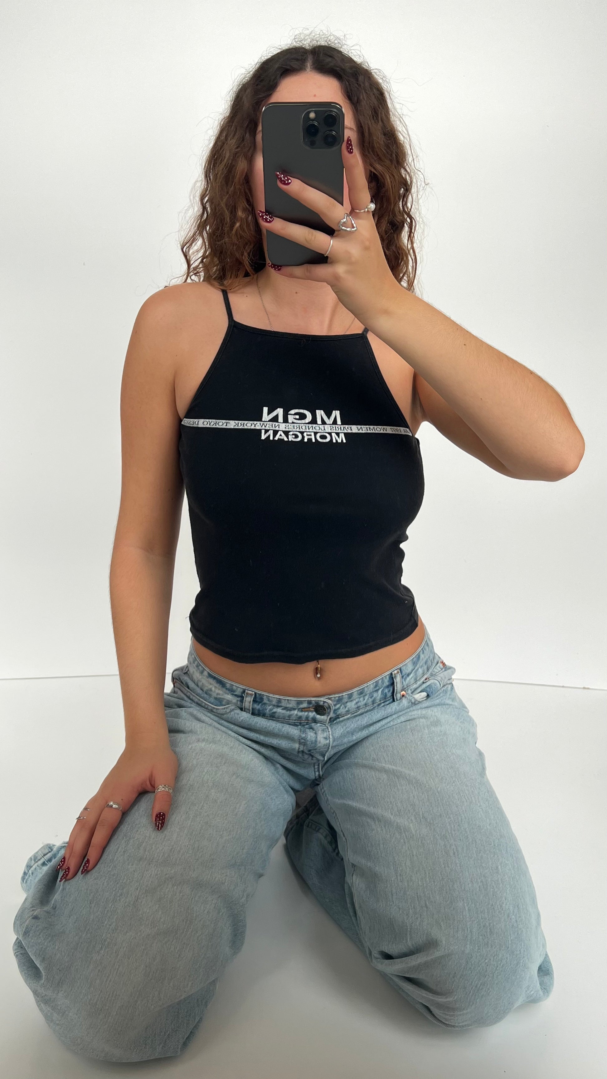Brand is vintage Morgan De Toi. Black spell out halter top.