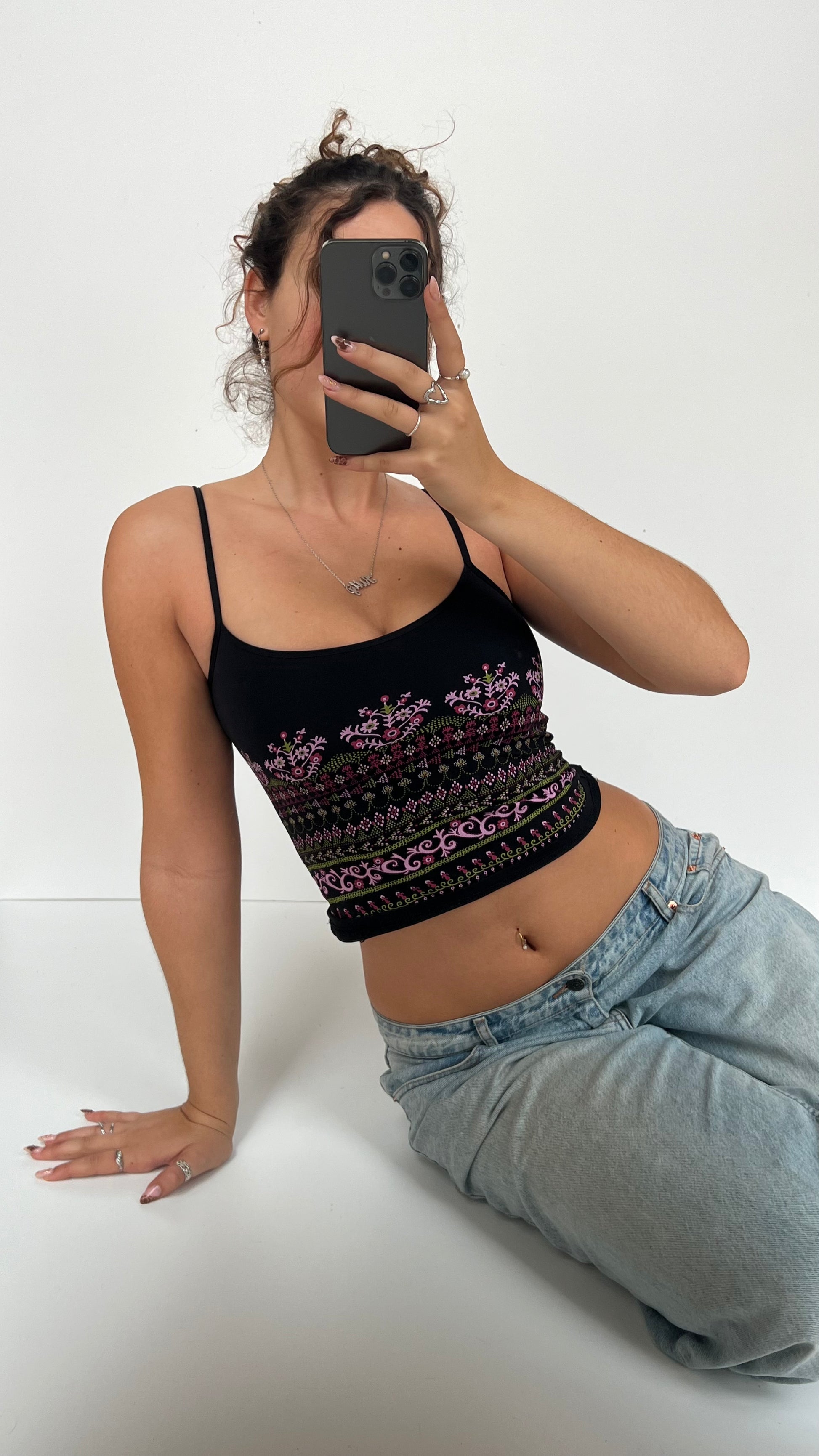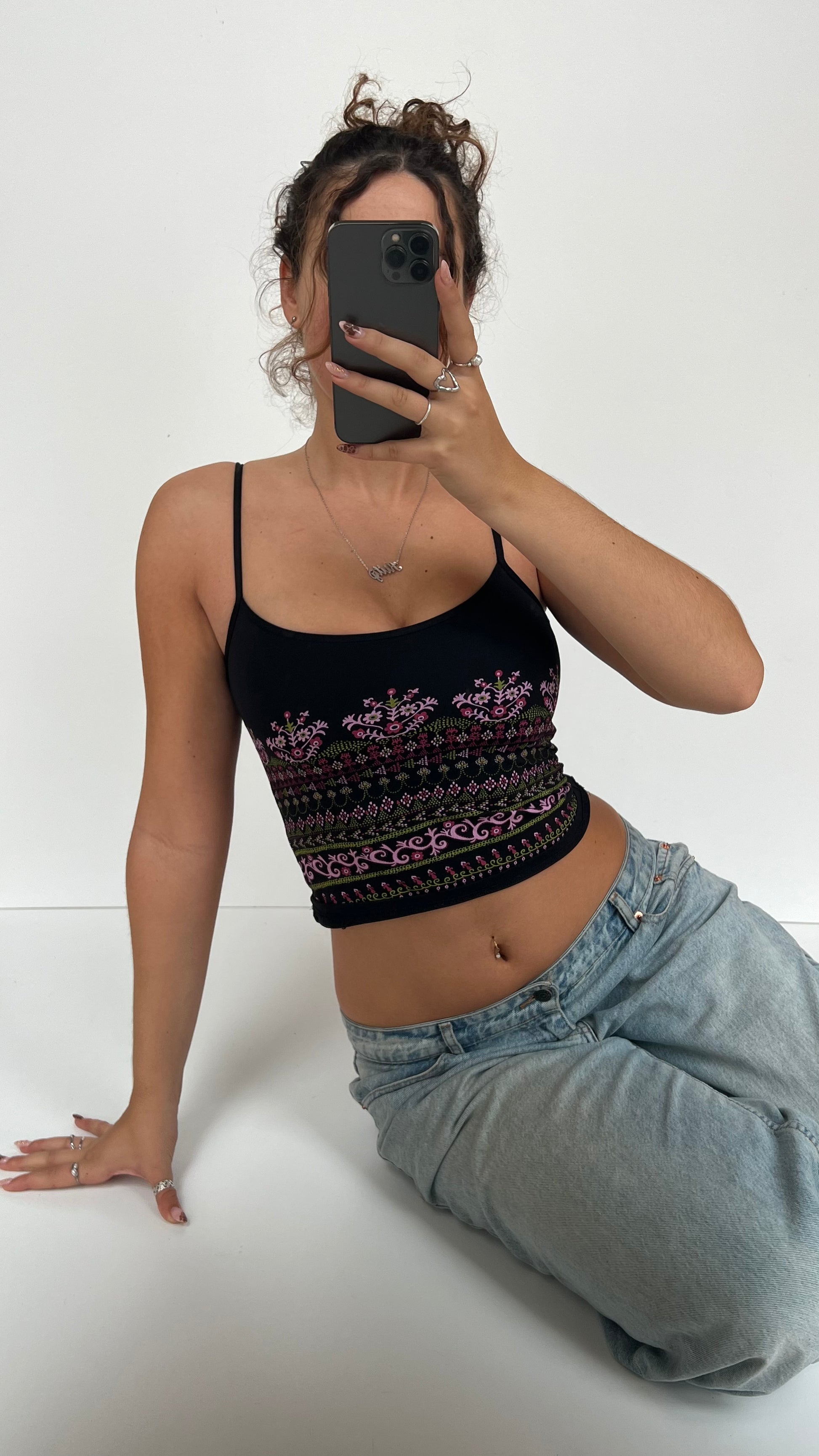 Brand is vintage Hennes. Black cami with pink pattern detailing.