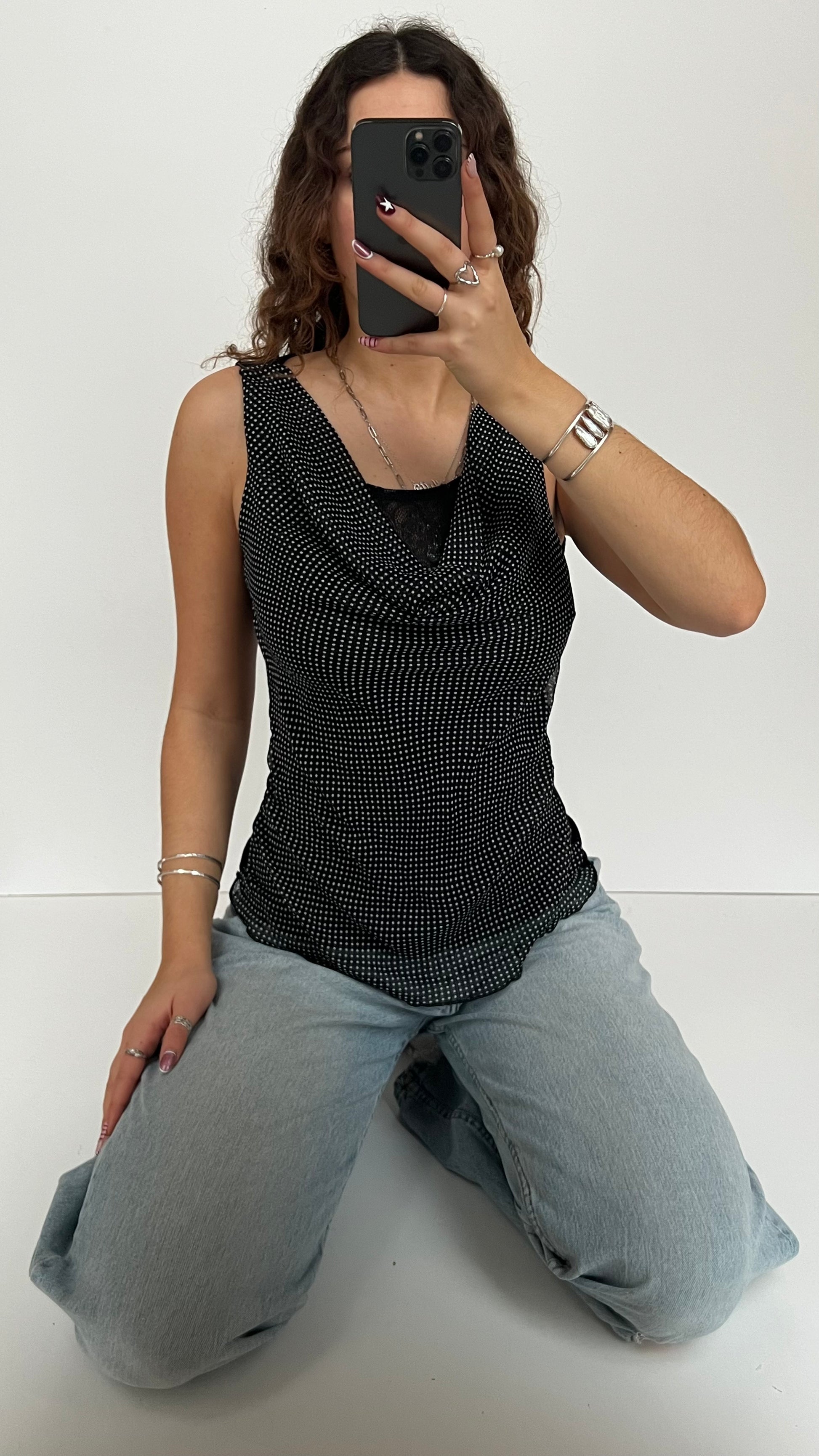 Mesh black and white polka dot cowl neck tank top.