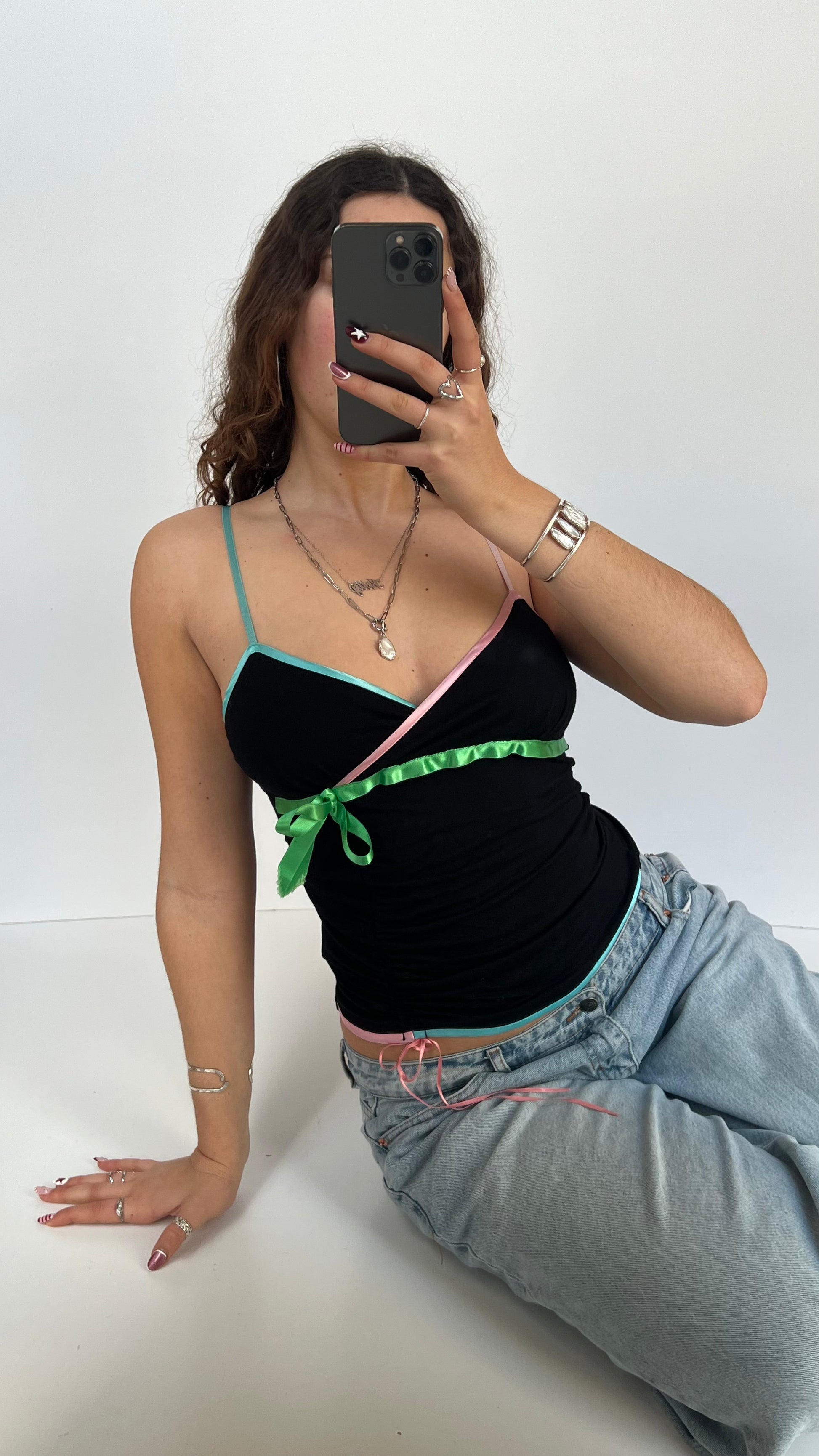 Stretchy black cami with colourful ribbon trim and ruched side detail. Adjustable straps.