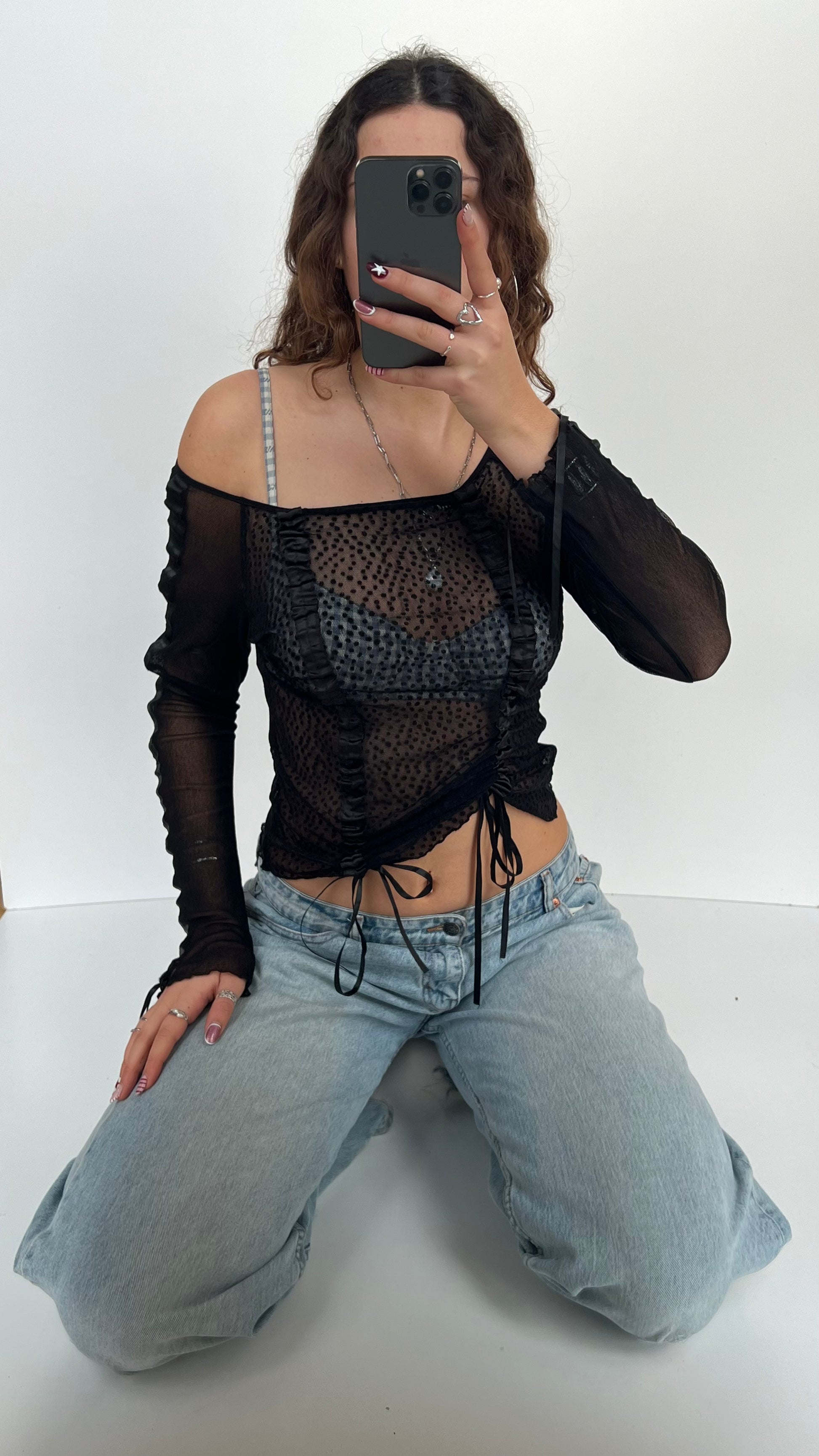 Black mesh long sleeve top with ruched details which can all be adjusted to customise the fit!