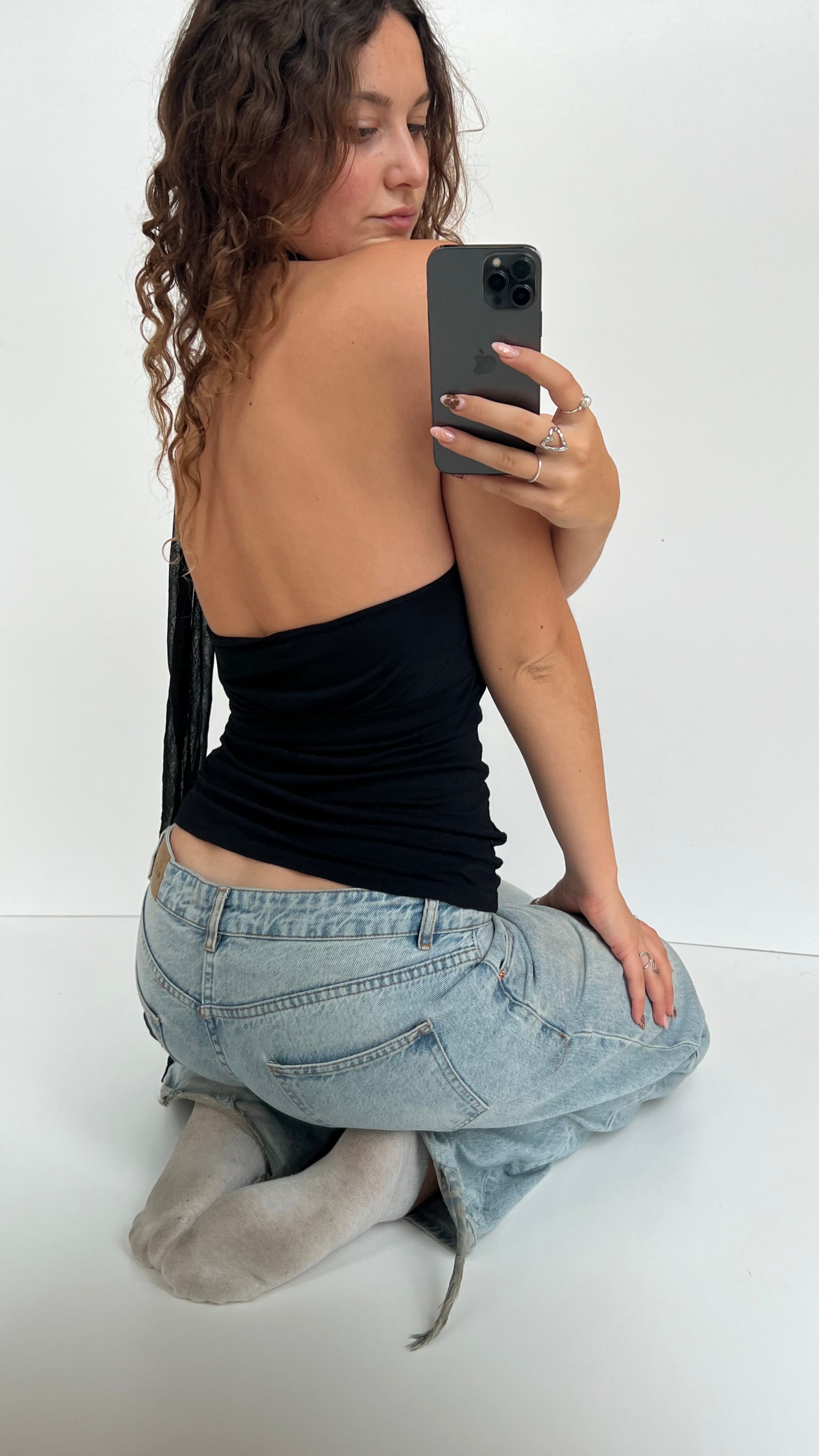 Black strapless cami with mesh one shoulder scarf tie. Drapes so beautifully!