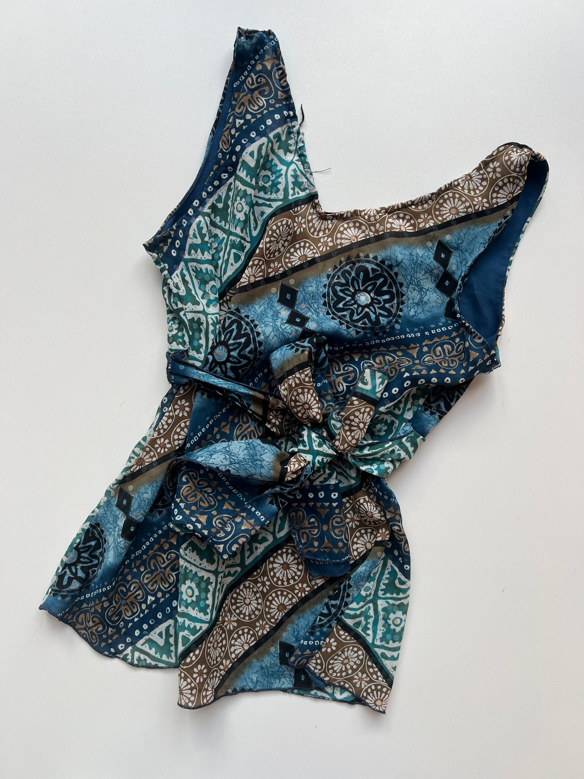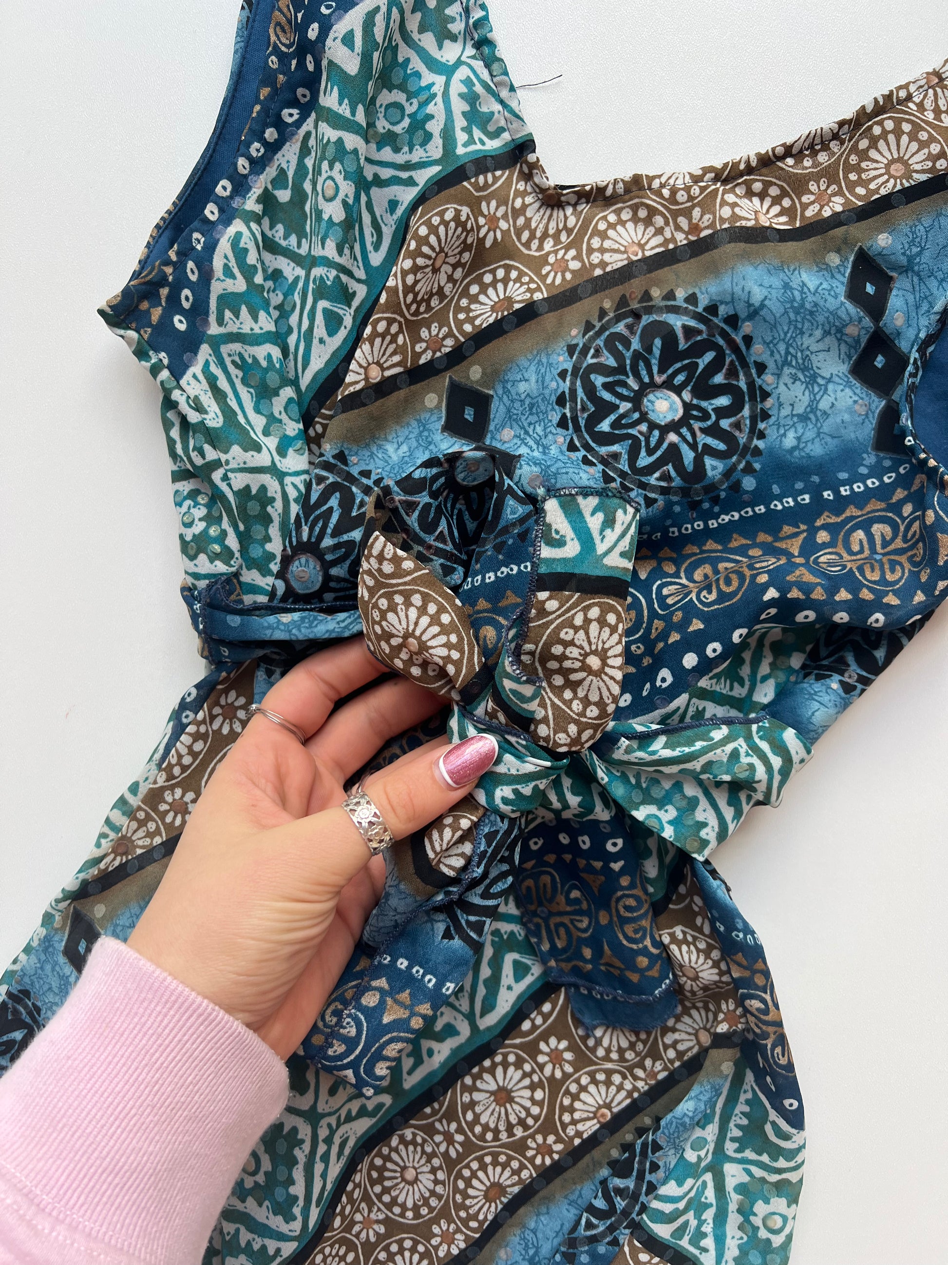 Blue paisley boho patterned mesh tank top with adjustable waist tie.