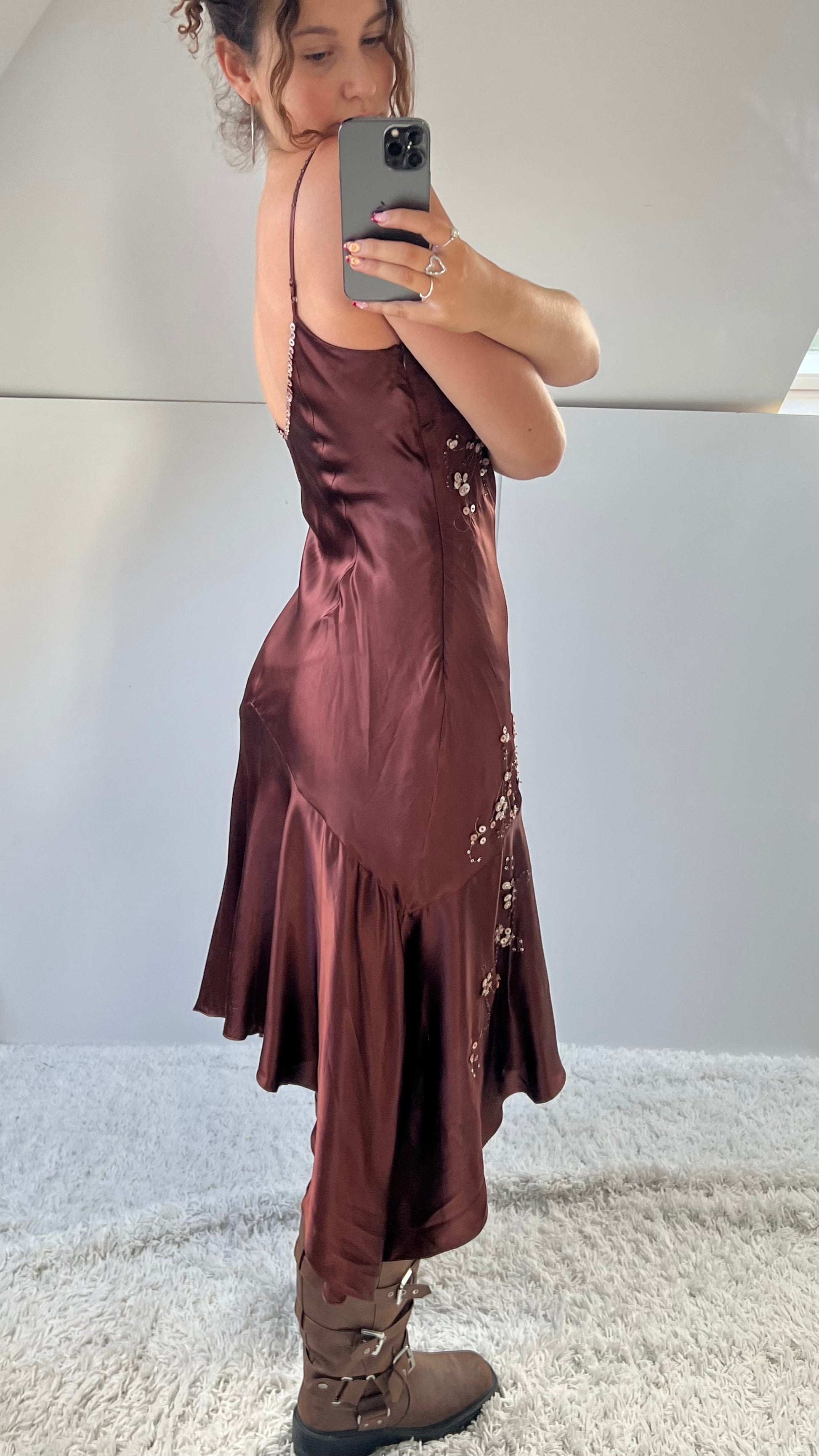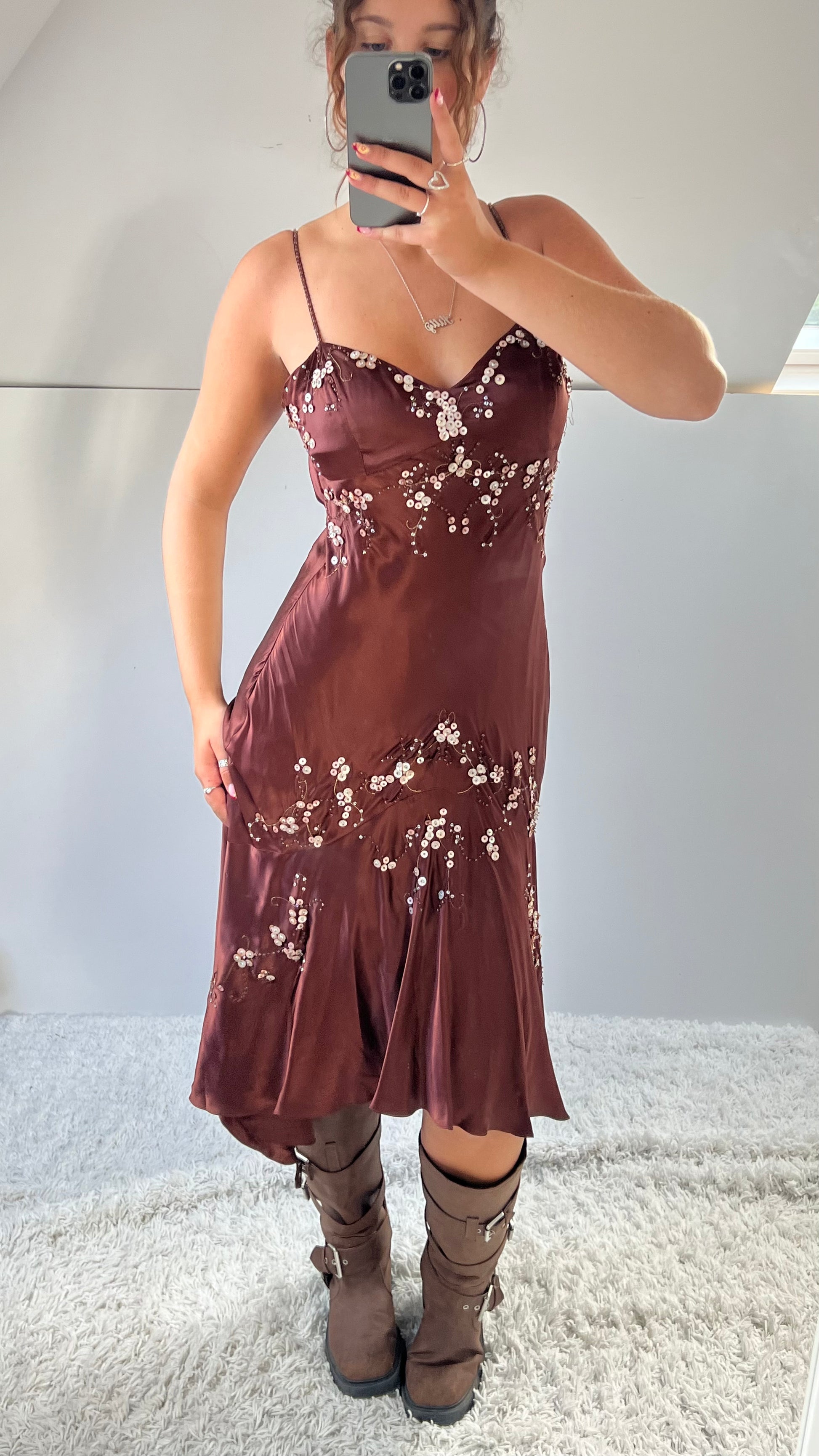INSANE chocolate brown 100% silk floaty midi dress with beaded sequin glitter design. The softest dress ever!