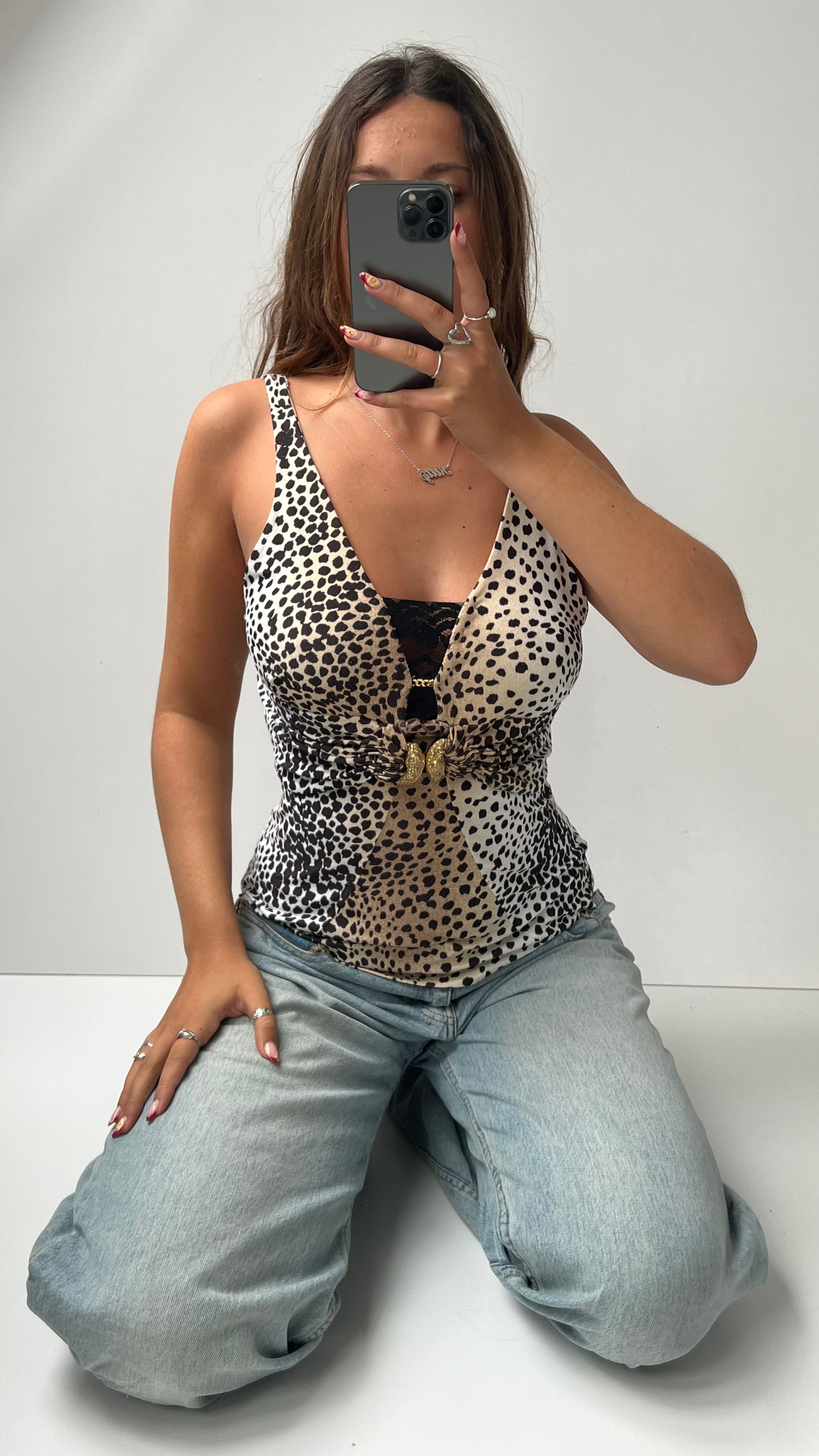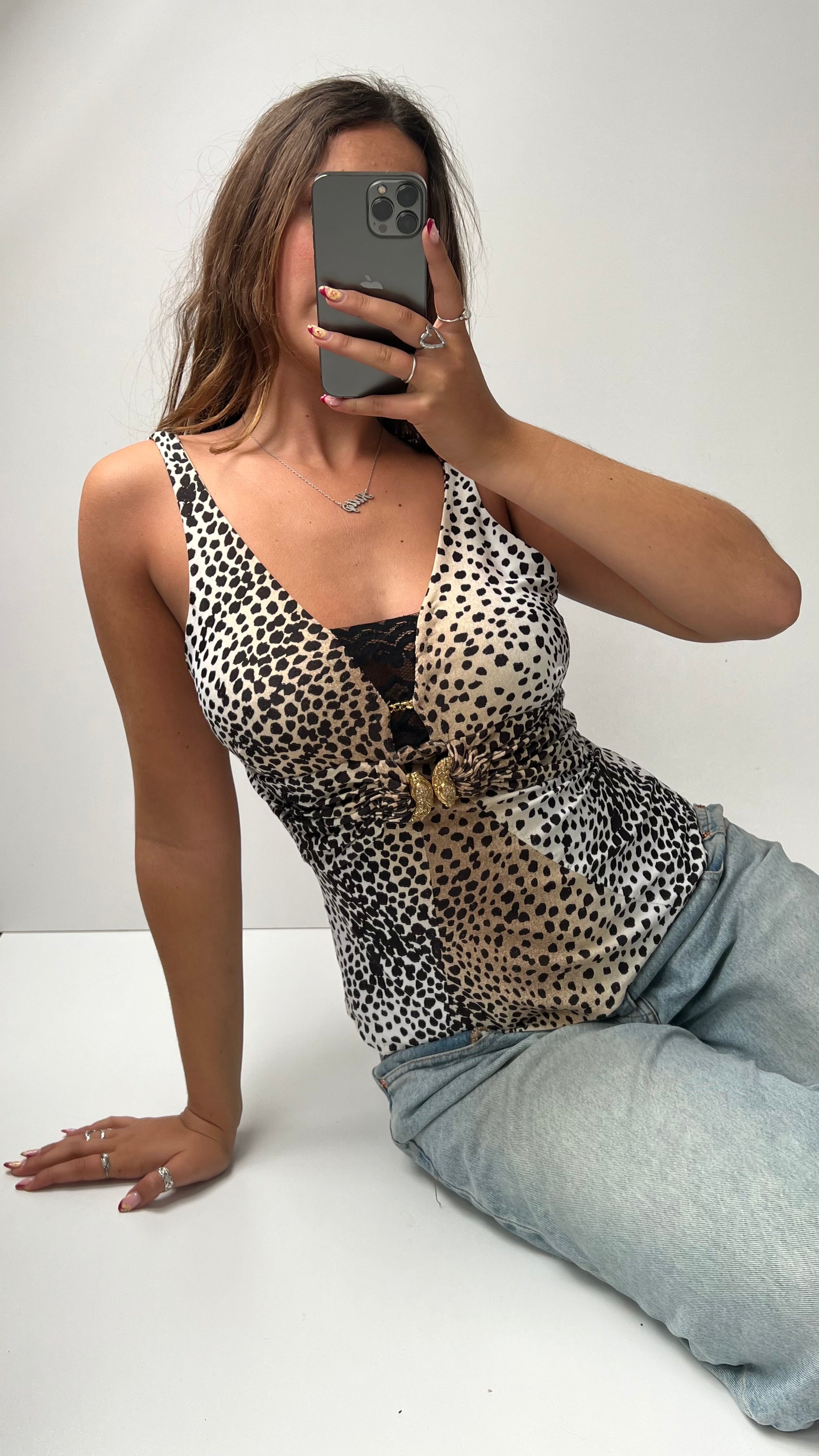 Brand is vintage Roberto Cavalli. Insane leopard print slinky cami with gold jewelled snake charm details. Stretchy.