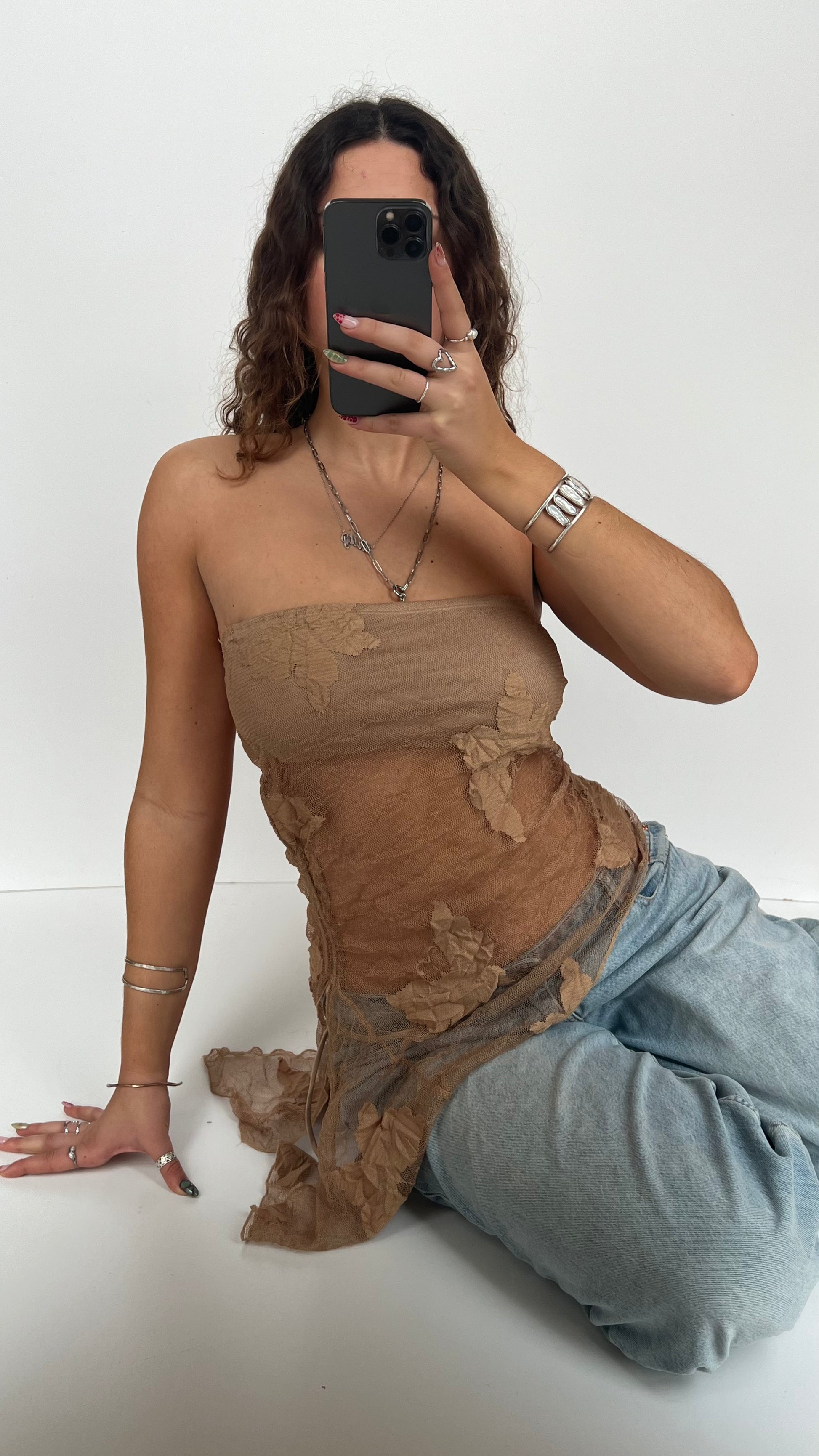 Brown mesh butterfly print asymmetric cami with lined bust.