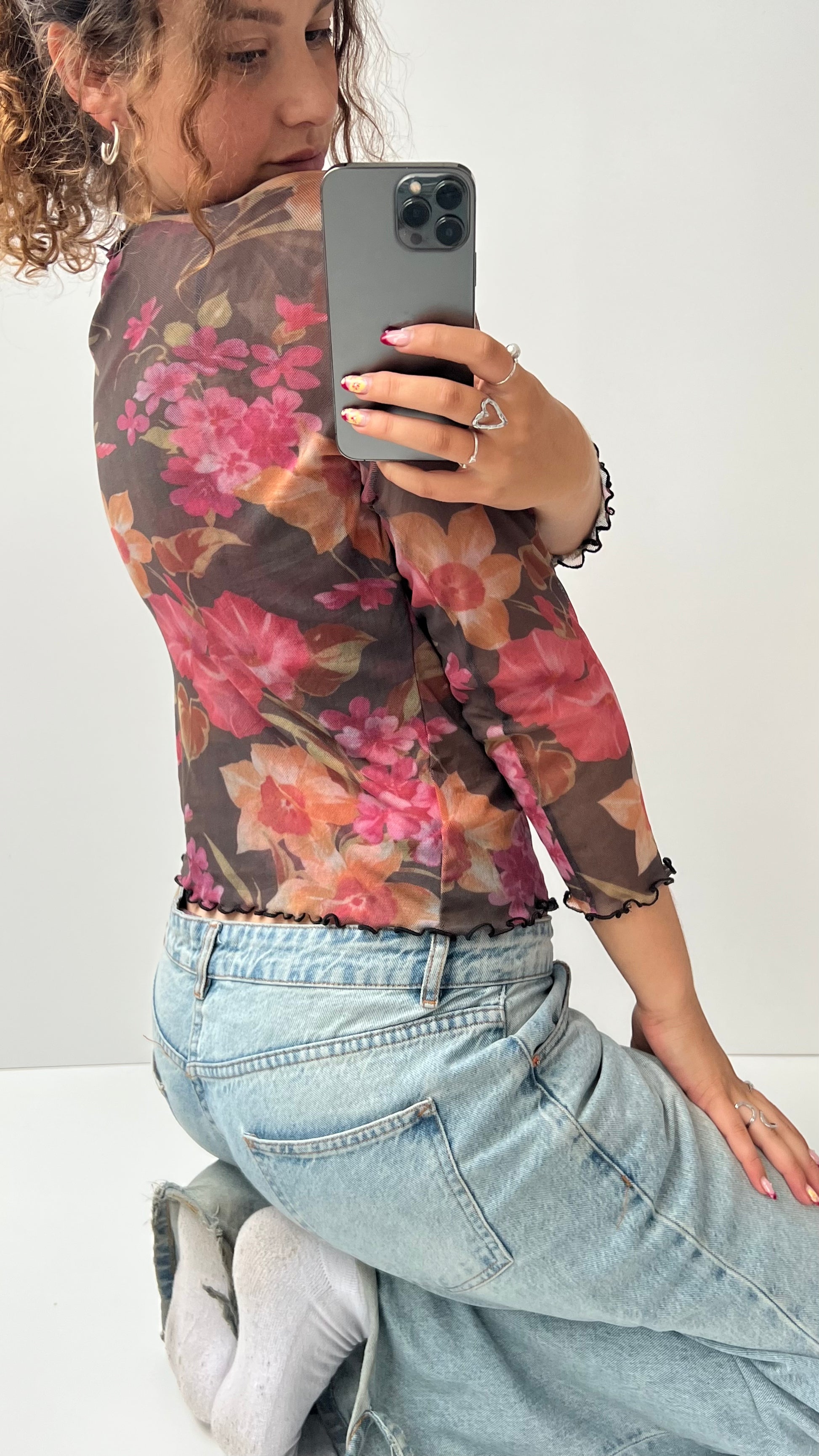 Brown pink double layer stretchy mesh floral long sleeve top.
