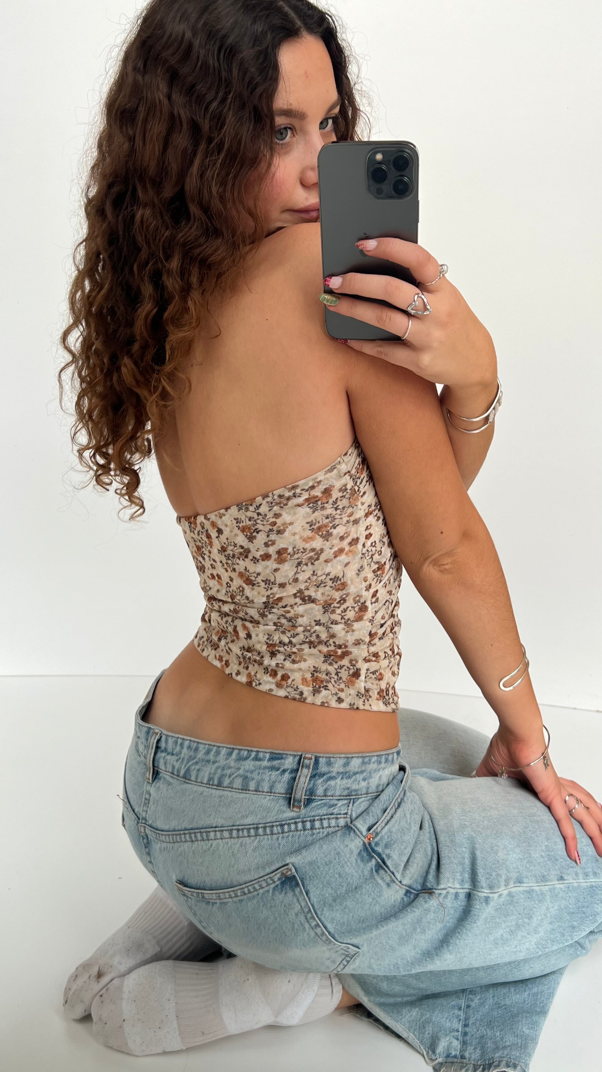 Cream brown floral mesh ruched halter cami. Stretchy with adjustable neck tie.