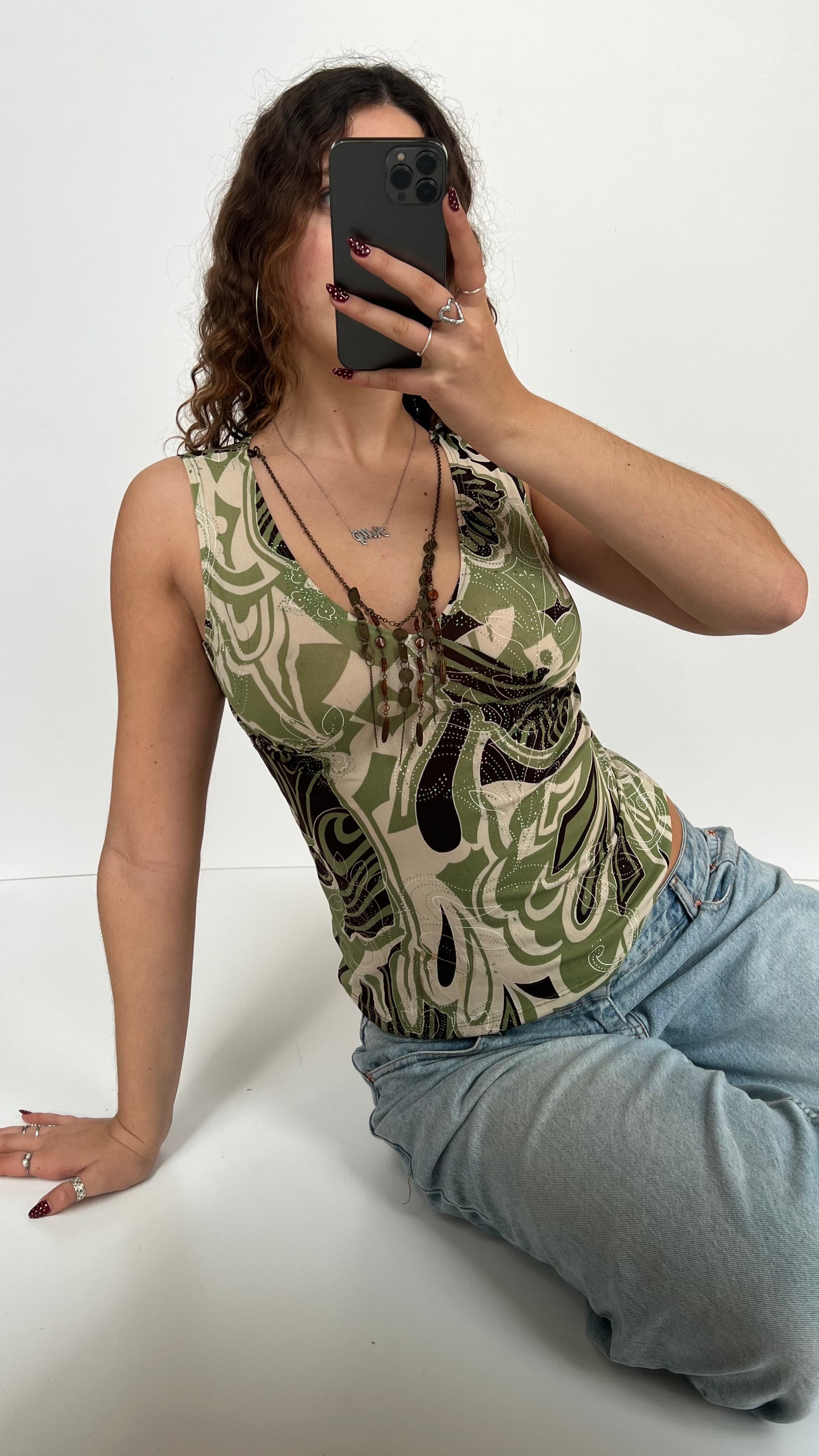 Green glitter patterned stretchy tank top with built in charm necklace.