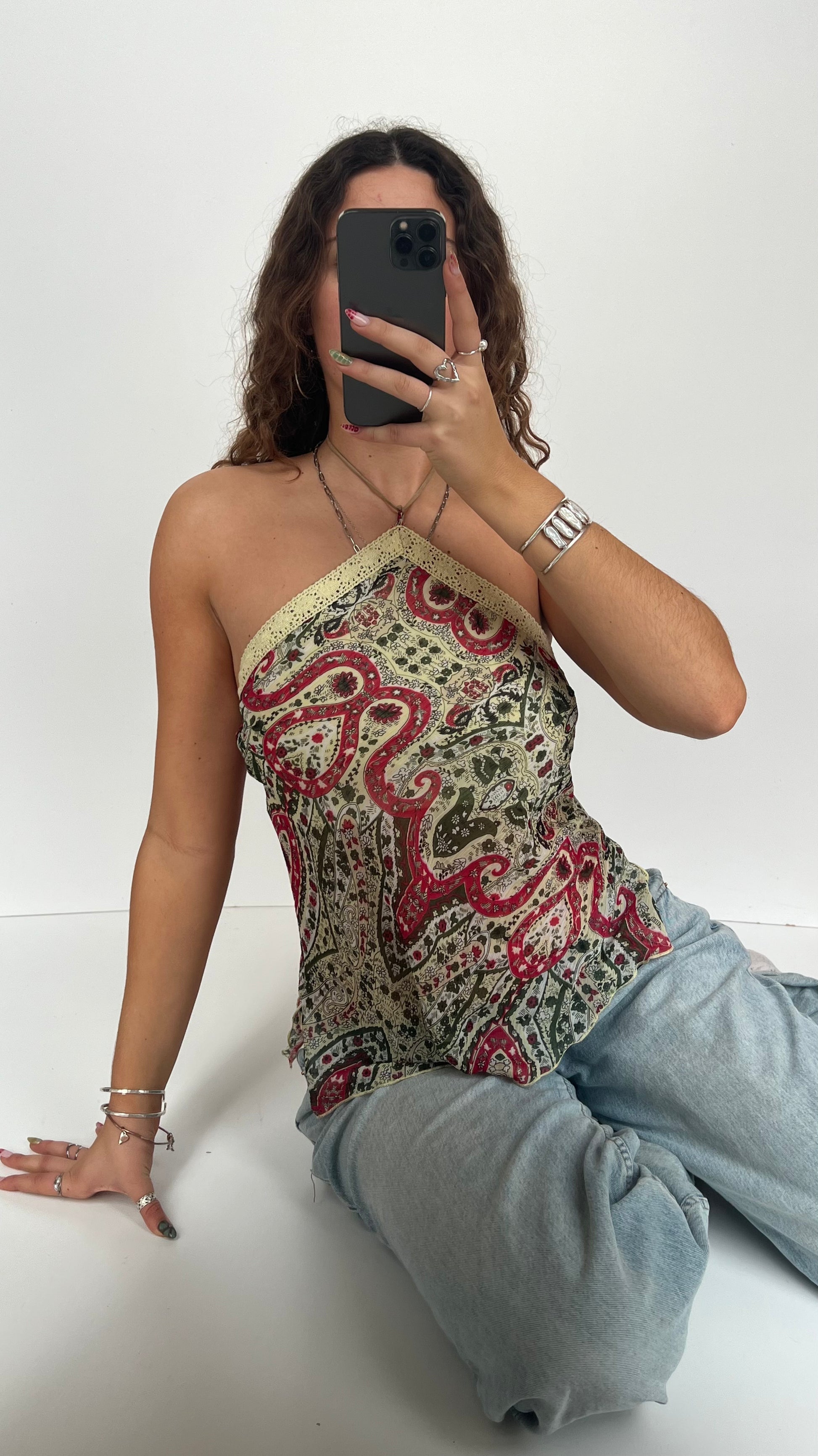 Green red paisley print mesh hanky hem halter cami with crochet trim and adjustable neck tie.