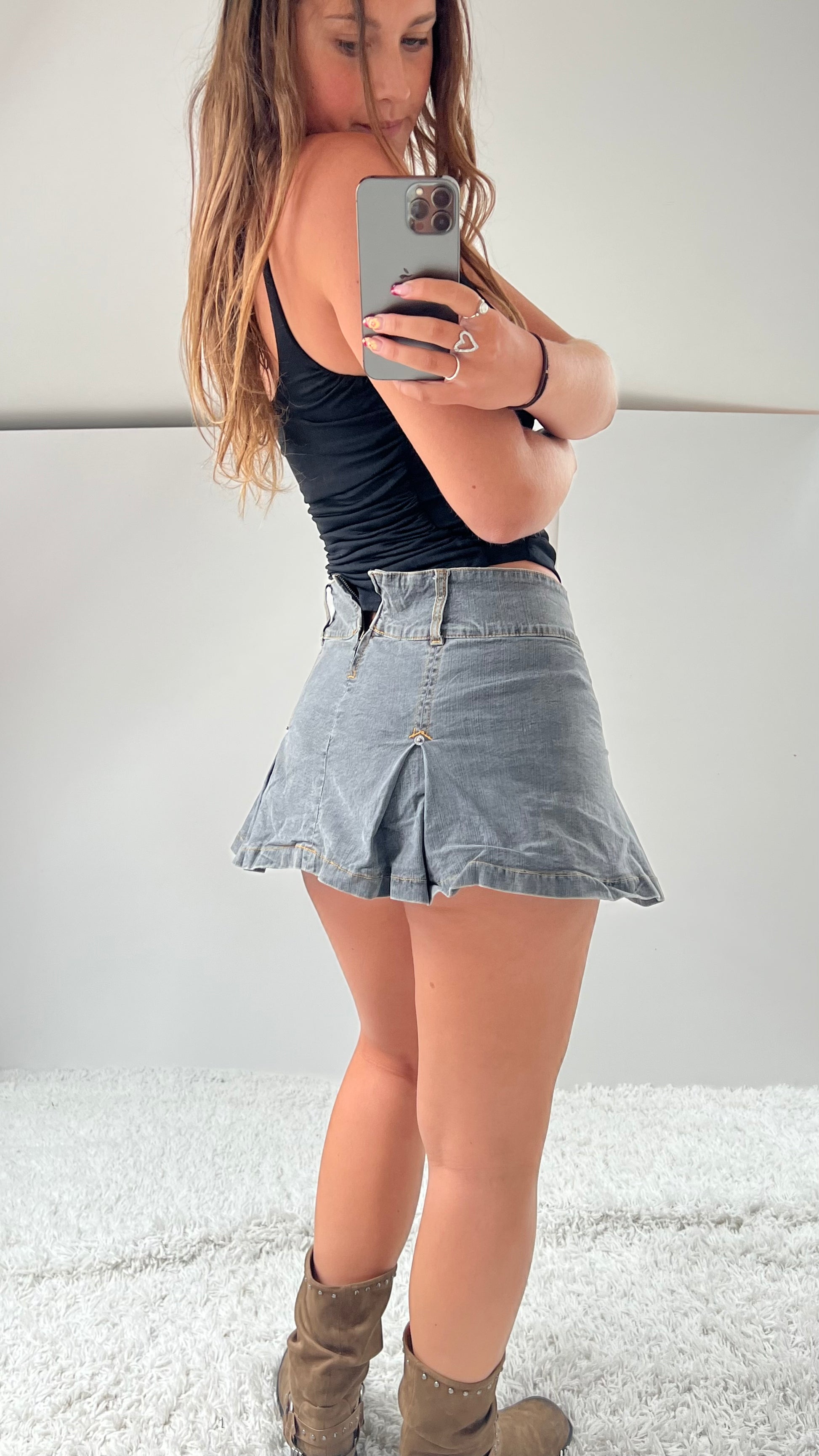 Grey low rise pleated denim mini skirt.
