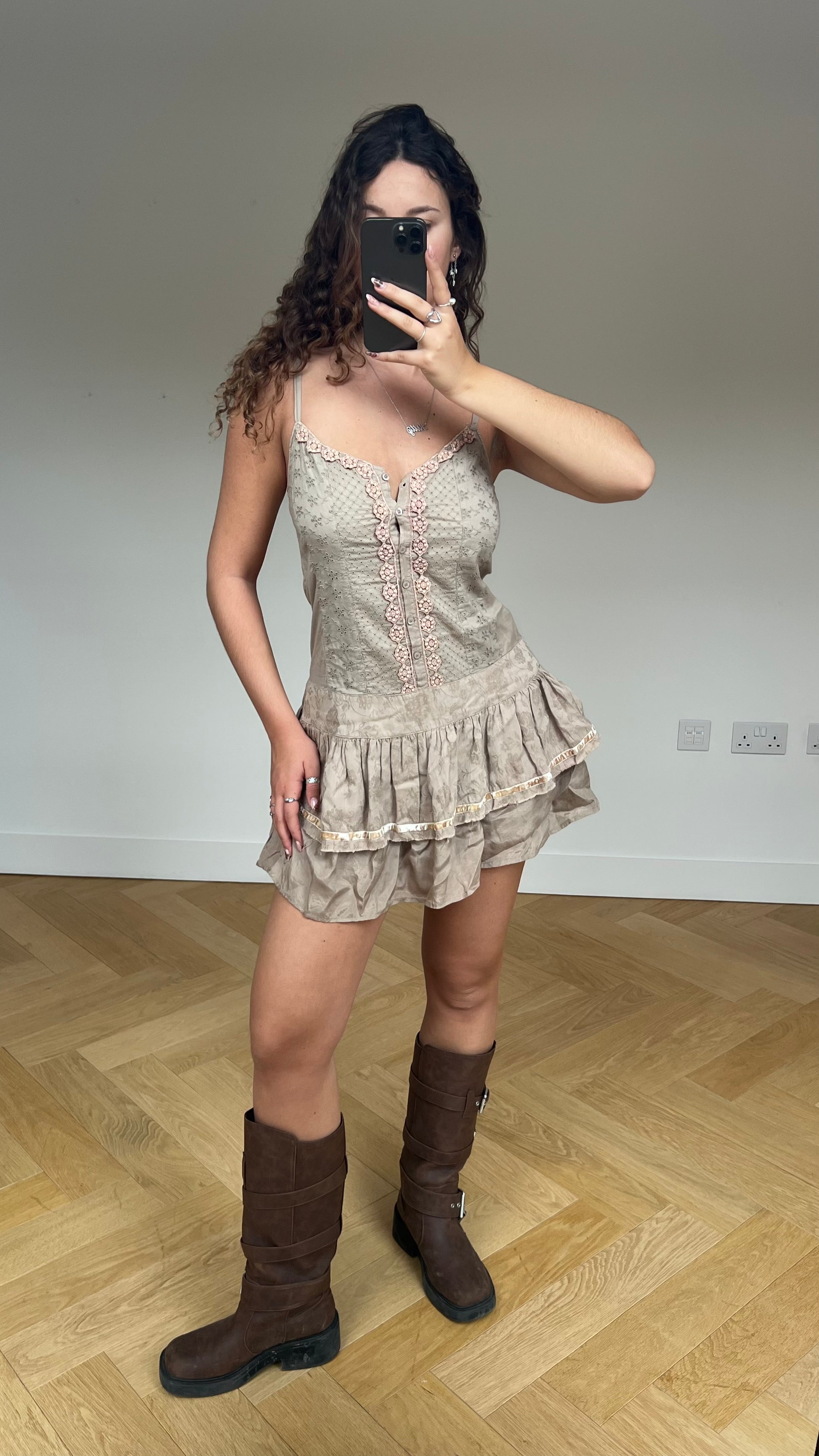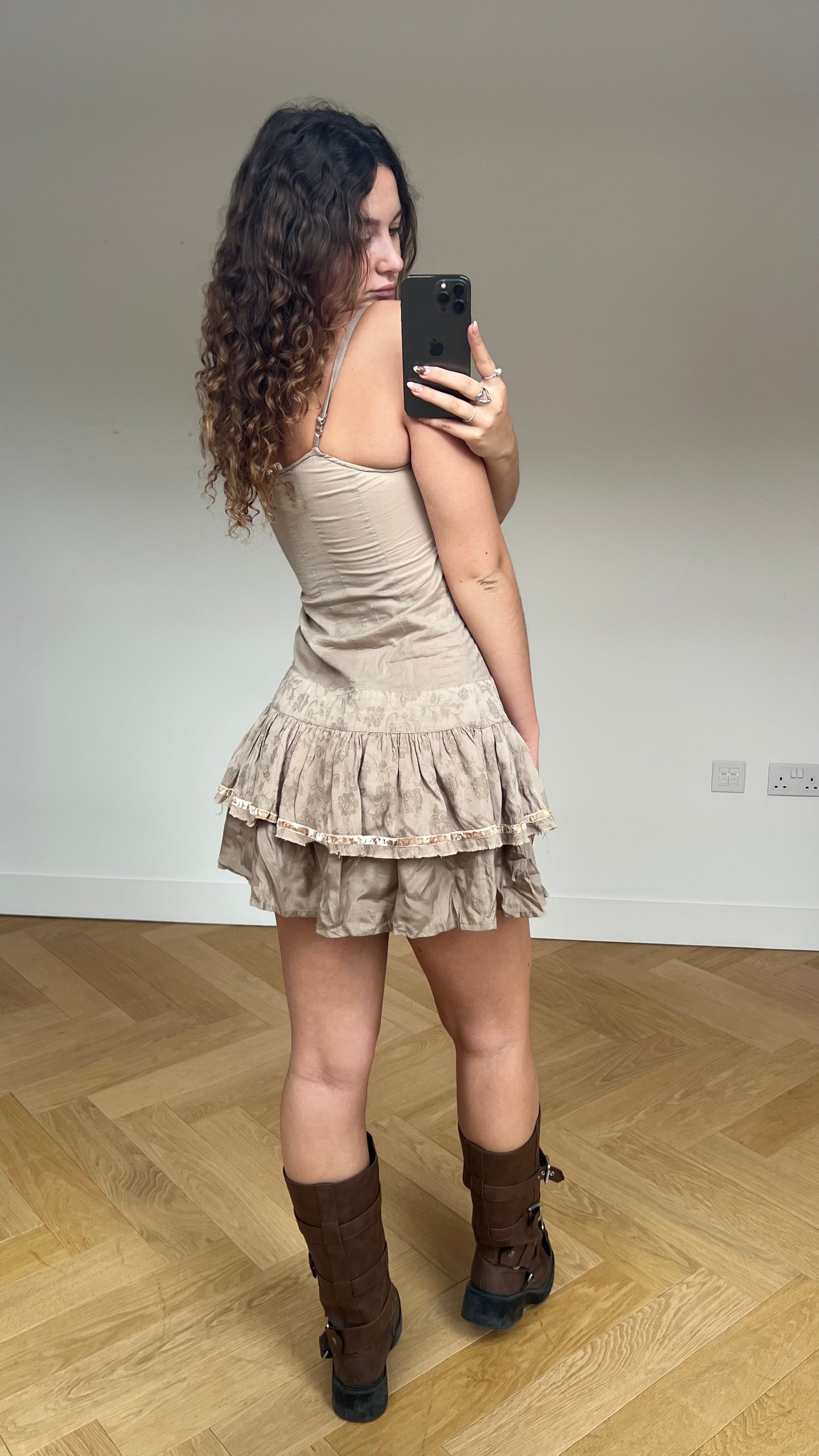 Brand is vintage Morgan De Toi. Brown beige ruffle embroidered mini dress.