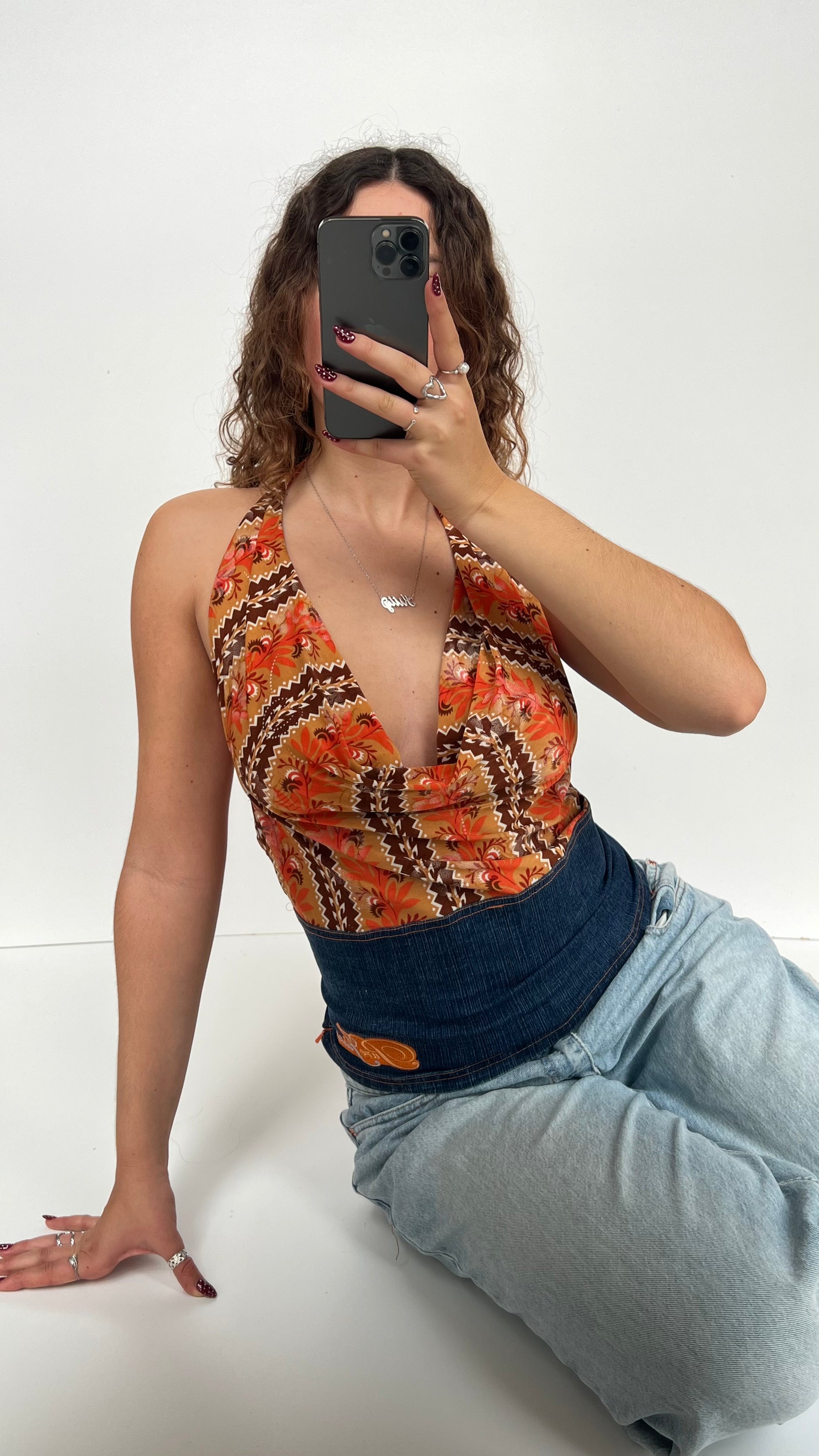 Contrast denim/orange patterned cowl neck halter cami. Stretchy.