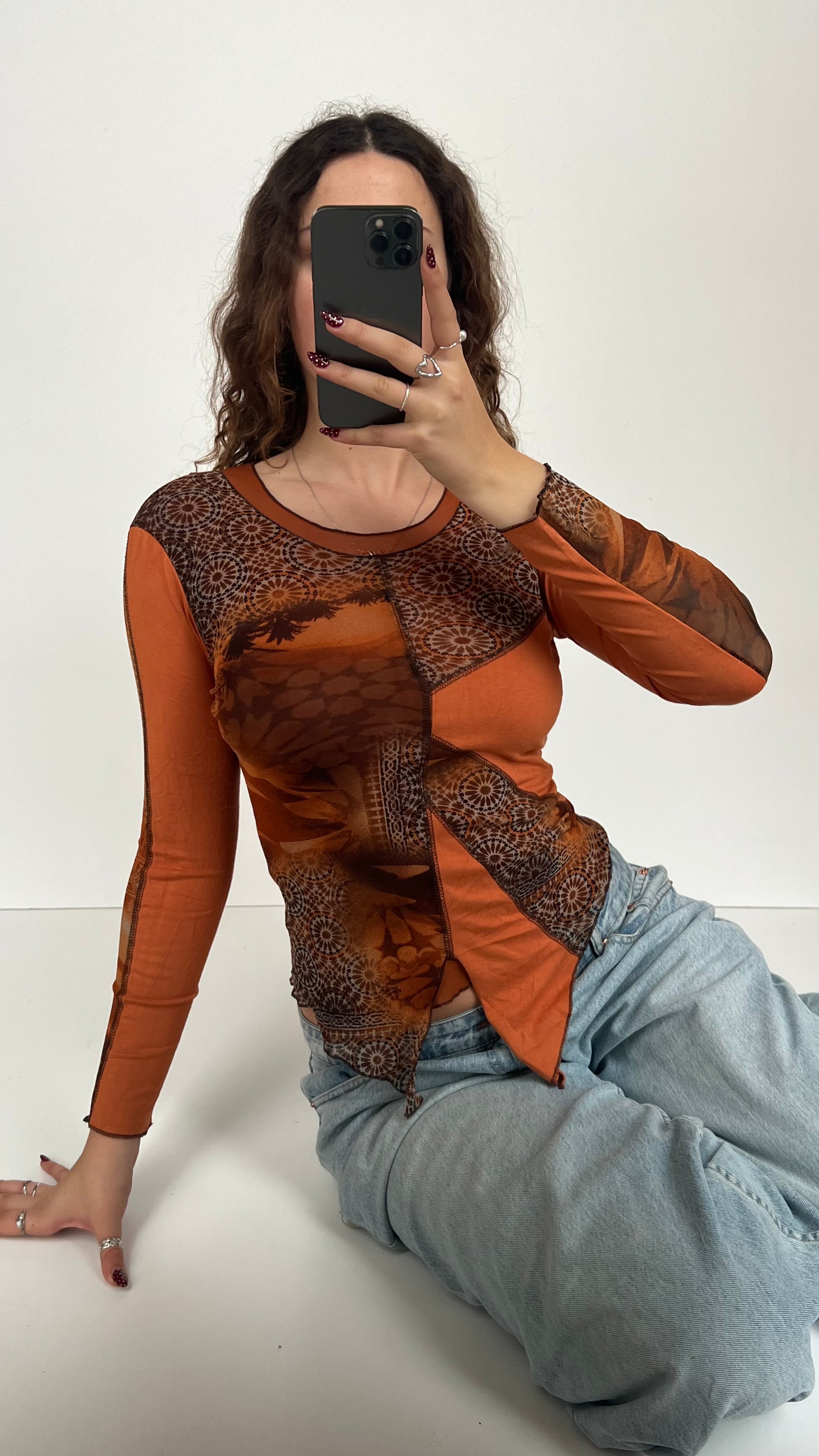 Patchwork orange mesh asymmetric long sleeve top. Stretchy.