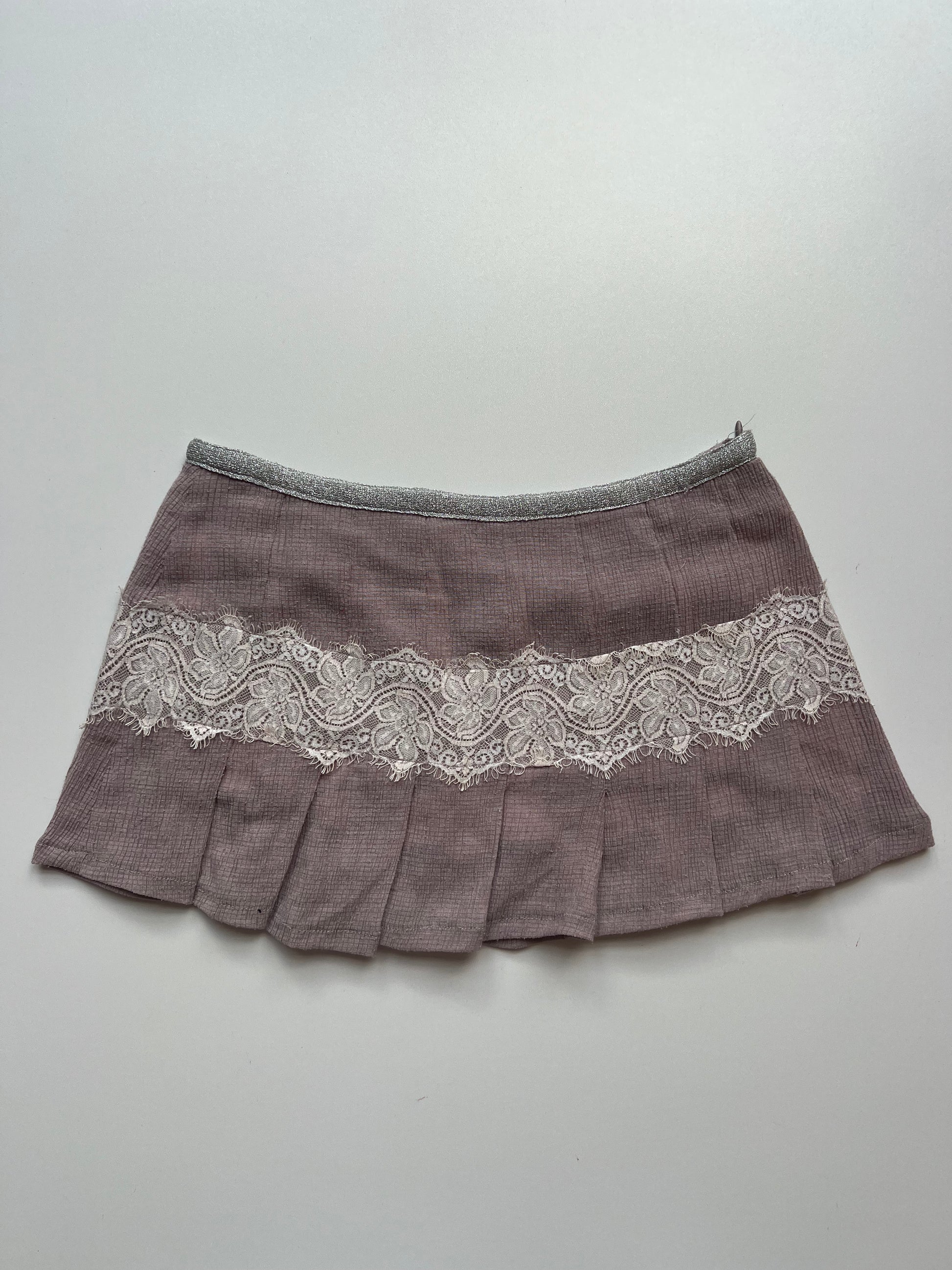 Low rise baby pink pleated micro mini skirt with white lace detail.