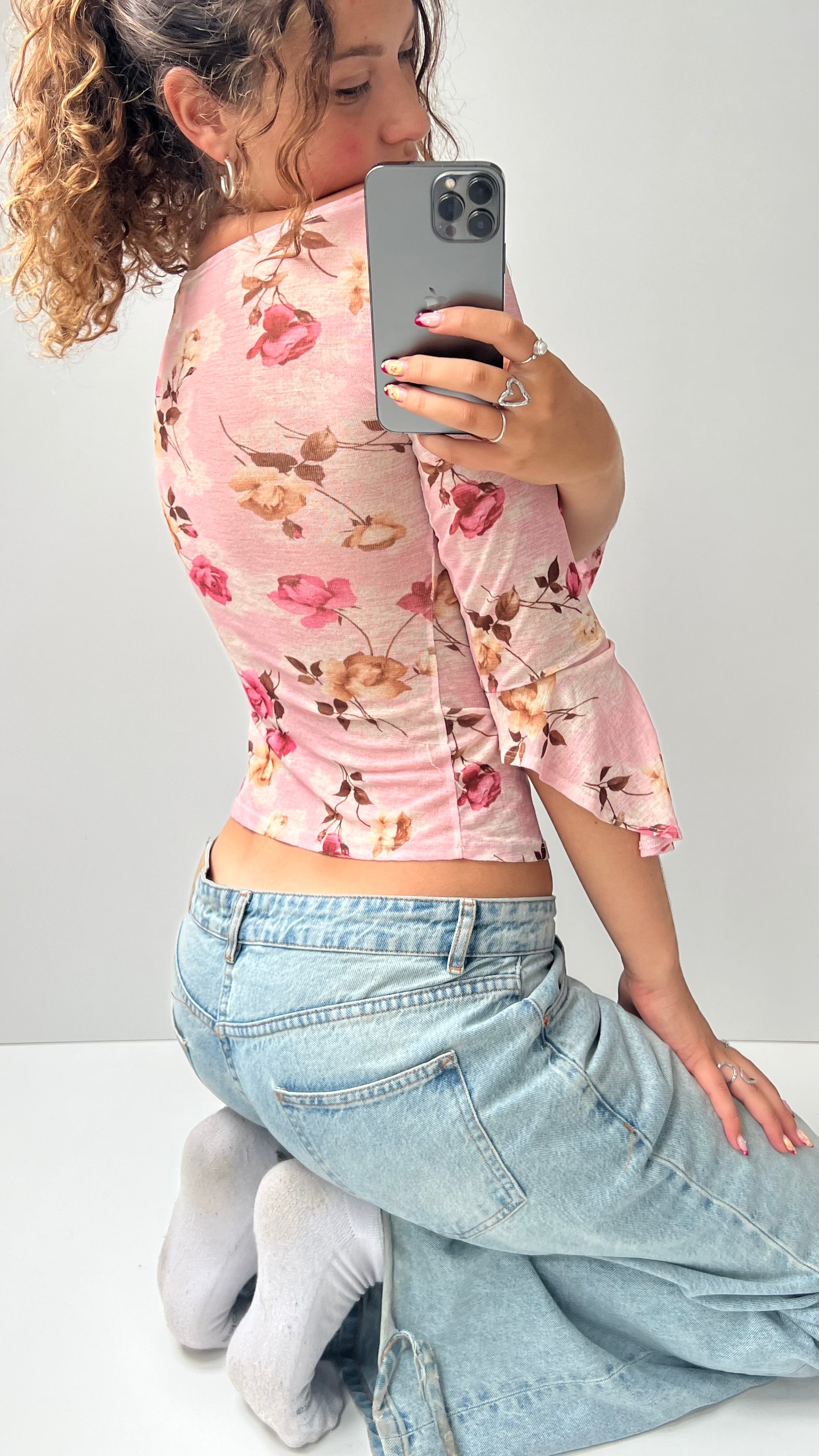 Pink mesh floral off the shoulder long sleeve top with flared sleeves.