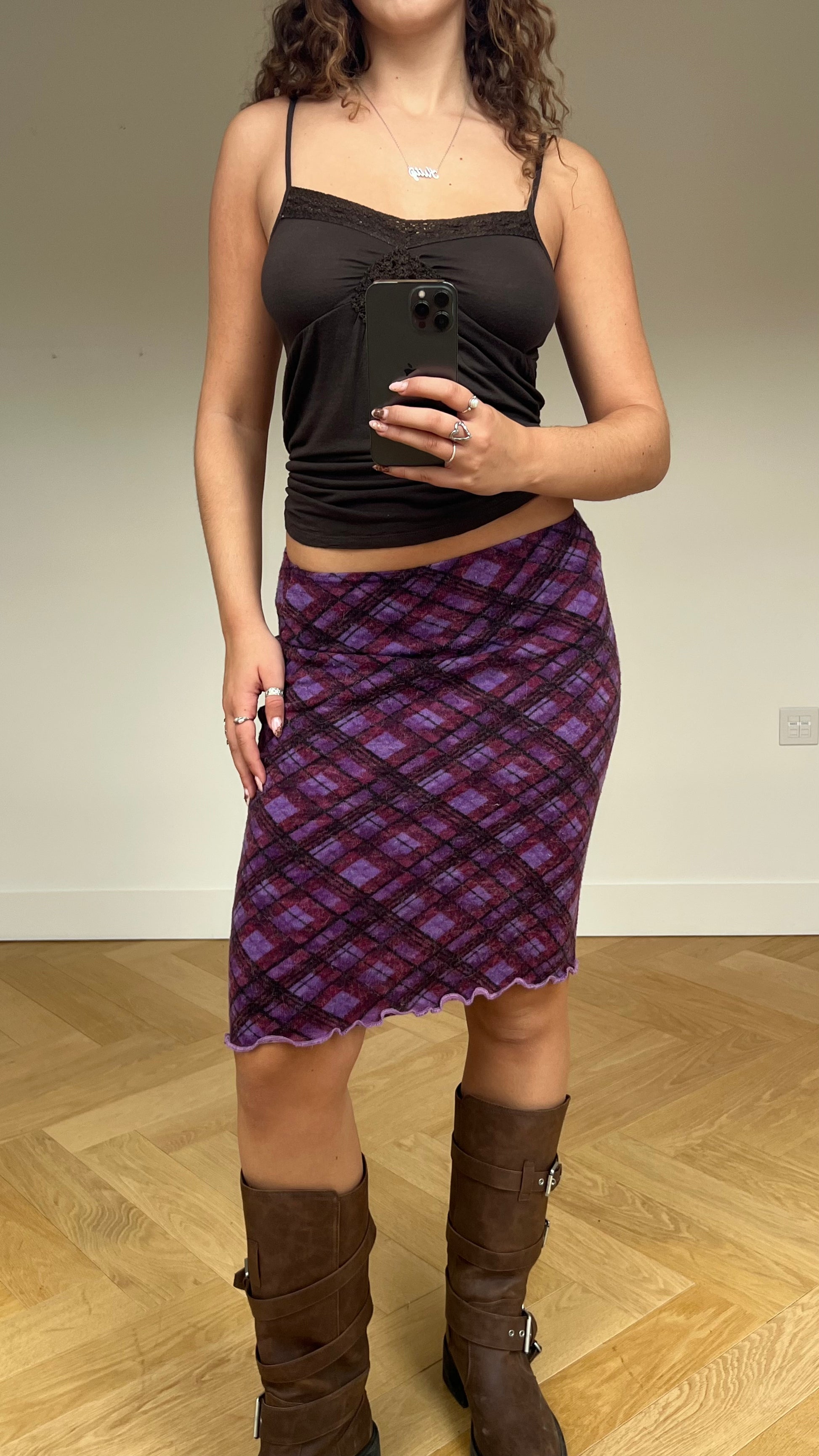 00s purple plaid midi skirt- size S