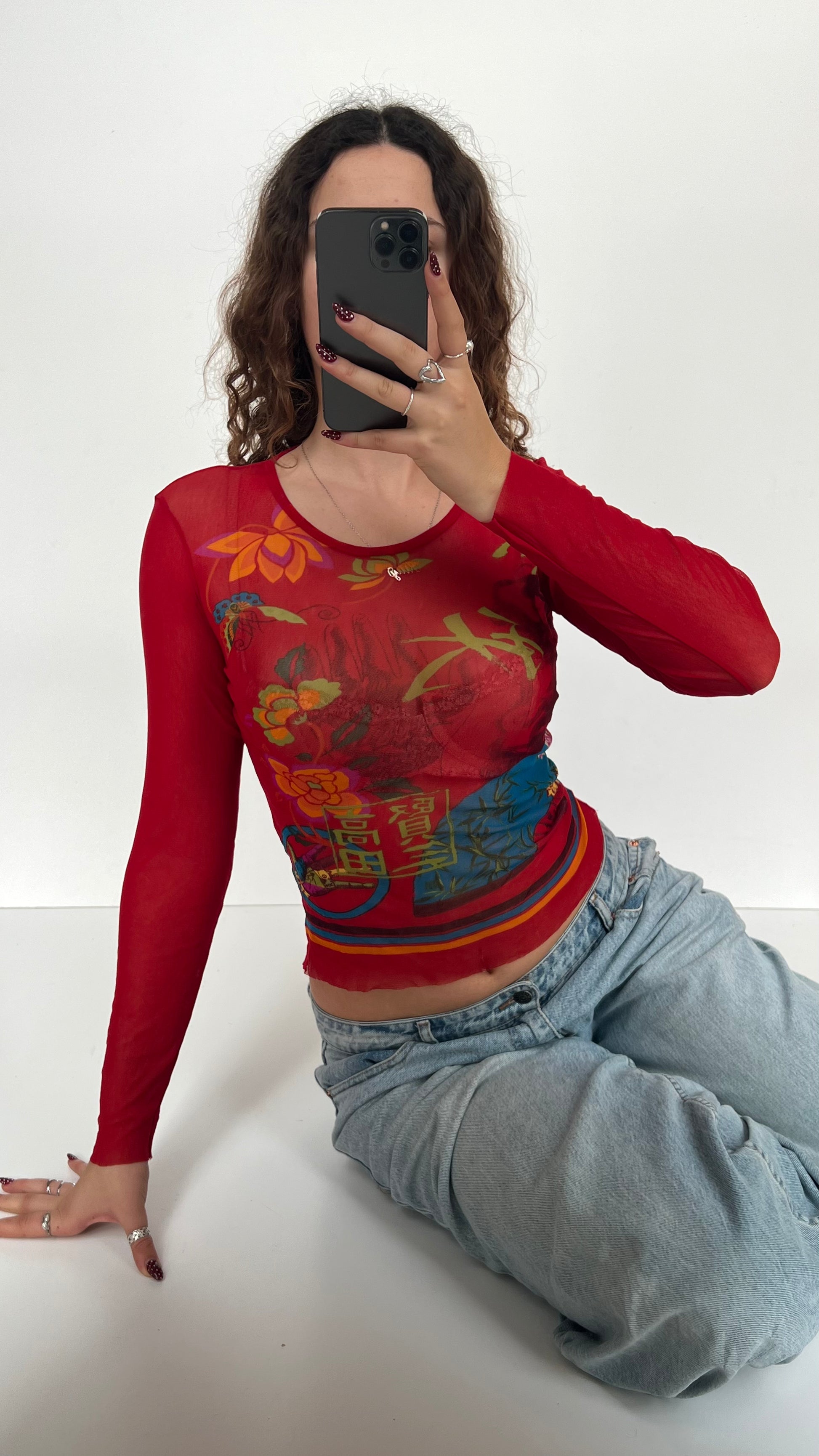 00s red mesh long sleeve stretchy top with Asian fan print.