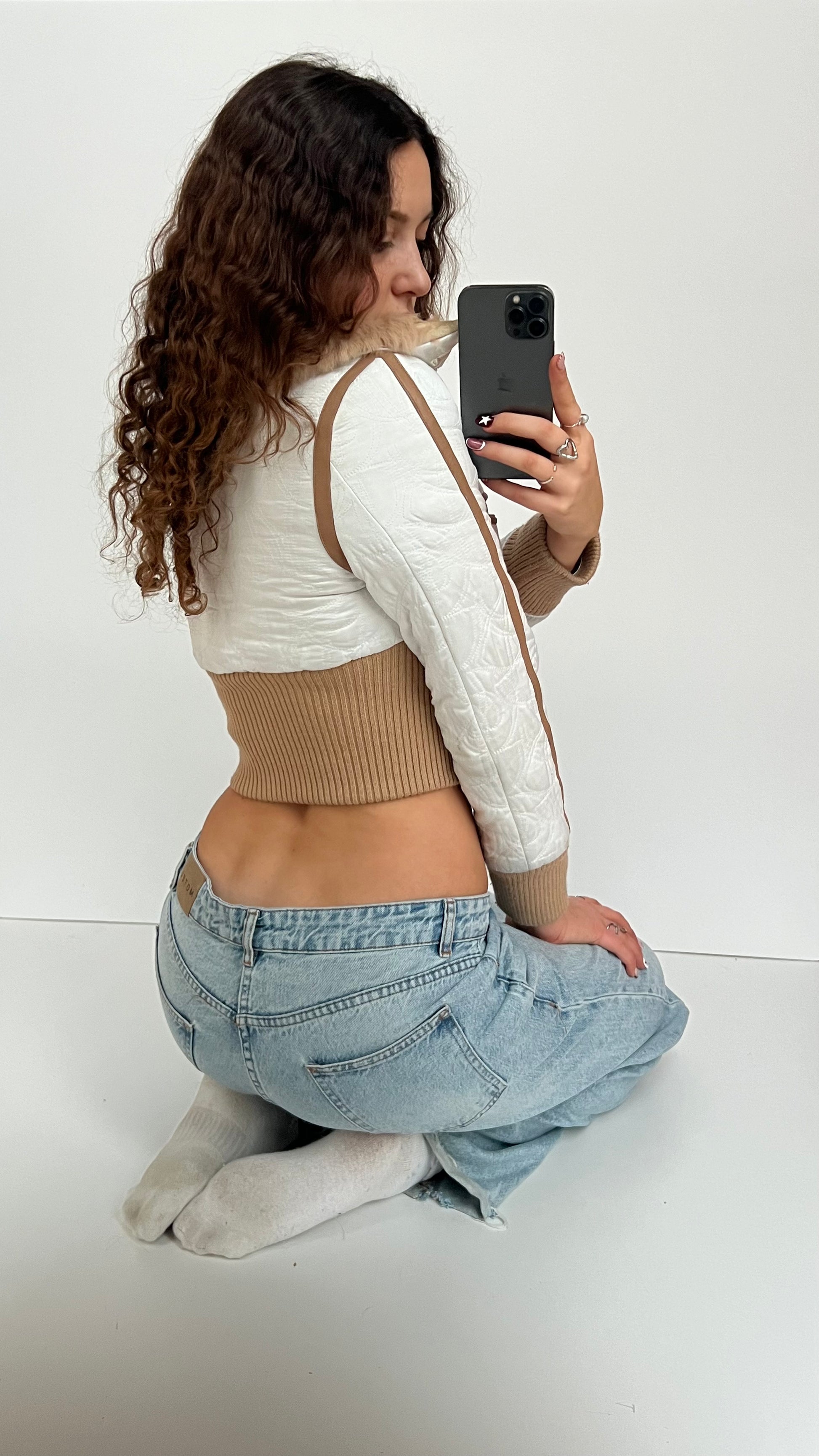 Brand is vintage Bebe. Cropepd white brown cinch waist puffer jacket with genuine fur collar.