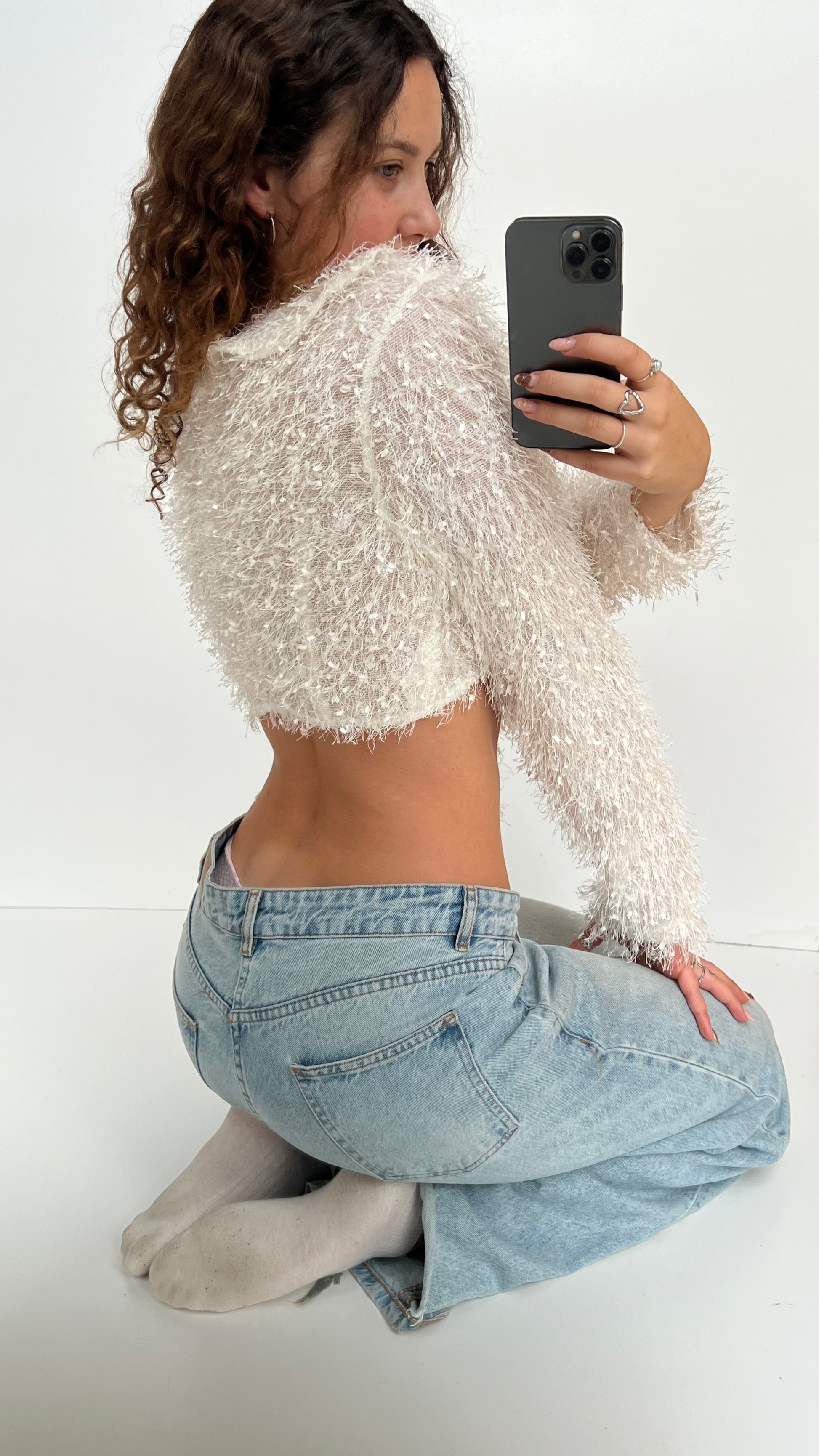 White fluffy long sleeve cropped cardigan. Stretchy and soft.